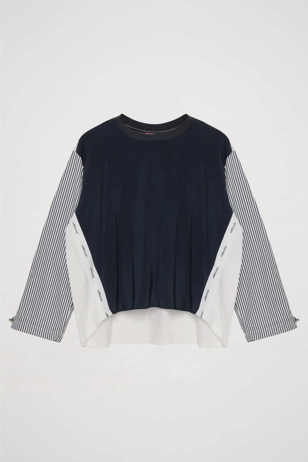 Farklı dokulardan oluşan kumaş kombinasyonlu, bisiklet yaka, uzun kollu, kolları çizgili, asimetrik kesim, yazı şerit detaylı, oversize sweatshirt.