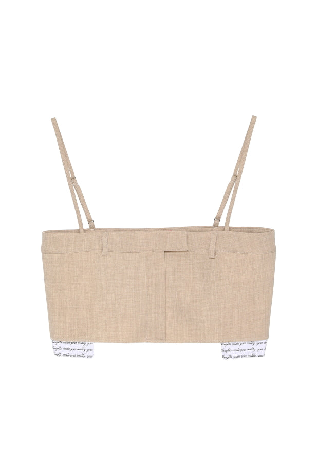 Kumaş matchli, ince askılı, gizli fermuar detaylı, kemer detay yakalı crop bluz.