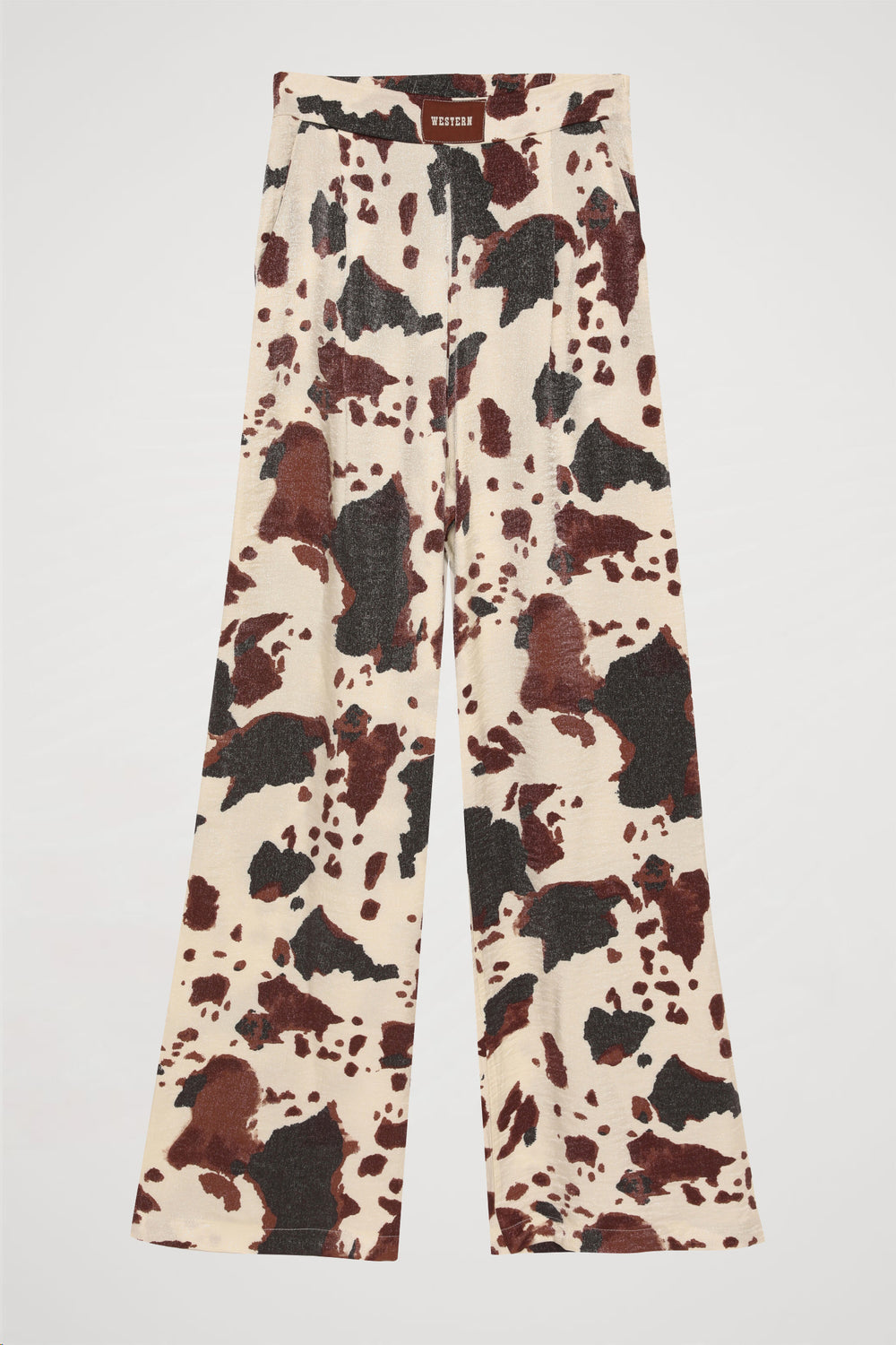 Leke desenli, yüksek bel, çift cepli, arka beli lastikli, yandan fermuar kapamalı, önü "western" etiket yazı baskılı, geniş paça uzun pantolon.