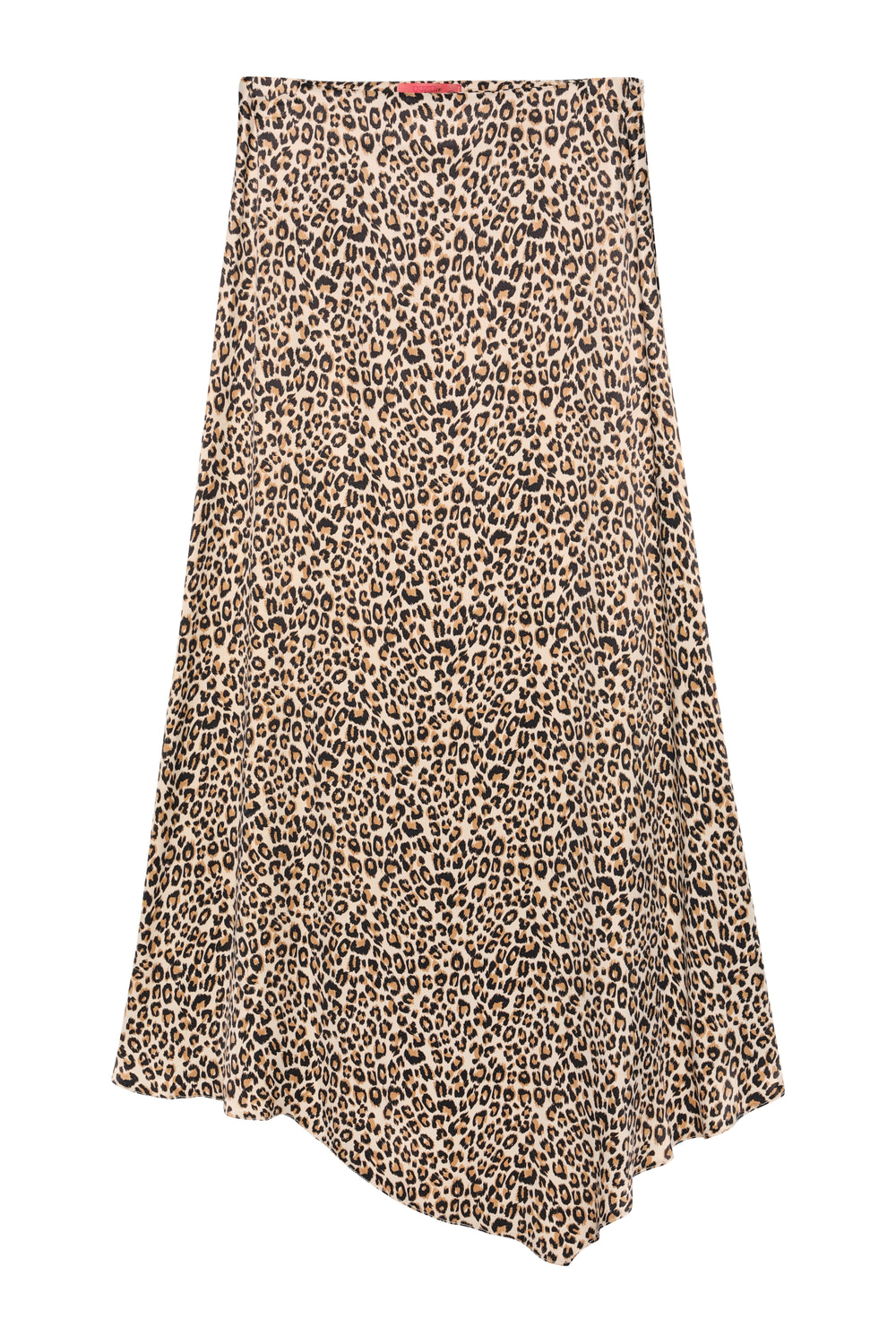 Leopar desenli, asimetrik kesim, saten midi boy etek.