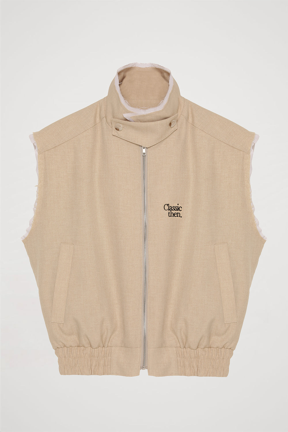 Nakış Yazılı Fermuarlı Kolsuz Yelek Bej