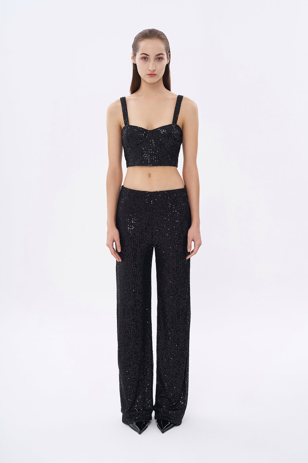 Kalın askılı, payet detaylı, sırtı fermuar kapamalı, crop büstiyer bluz.