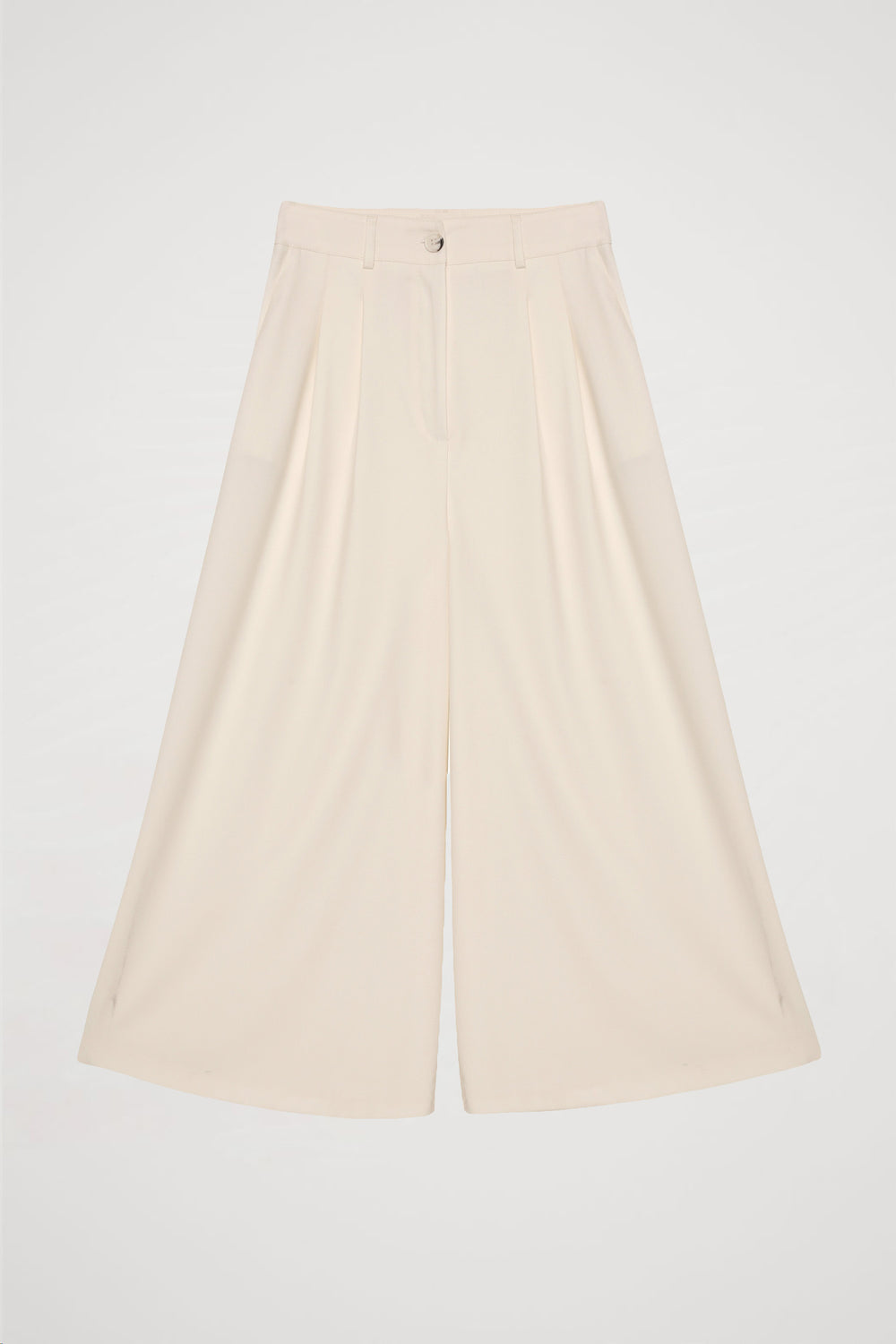 Yüksek bel, pile detaylı, çift cepli, düğme ve fermuar kapamalı, geniş paça pantolon.