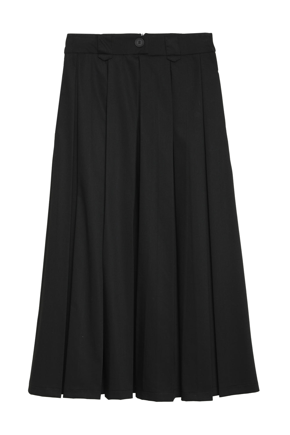 Yüksek bel, pile detaylı, düğme kapamalı, midi boy etek.