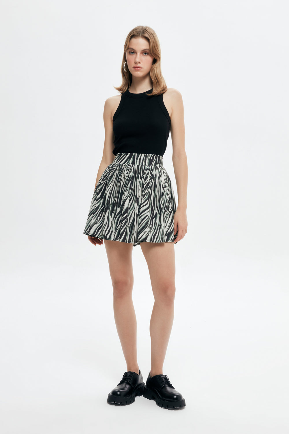Beli lastikli, yüksek bel, renkli pile detaylı, astarı şortlu, mini etek.