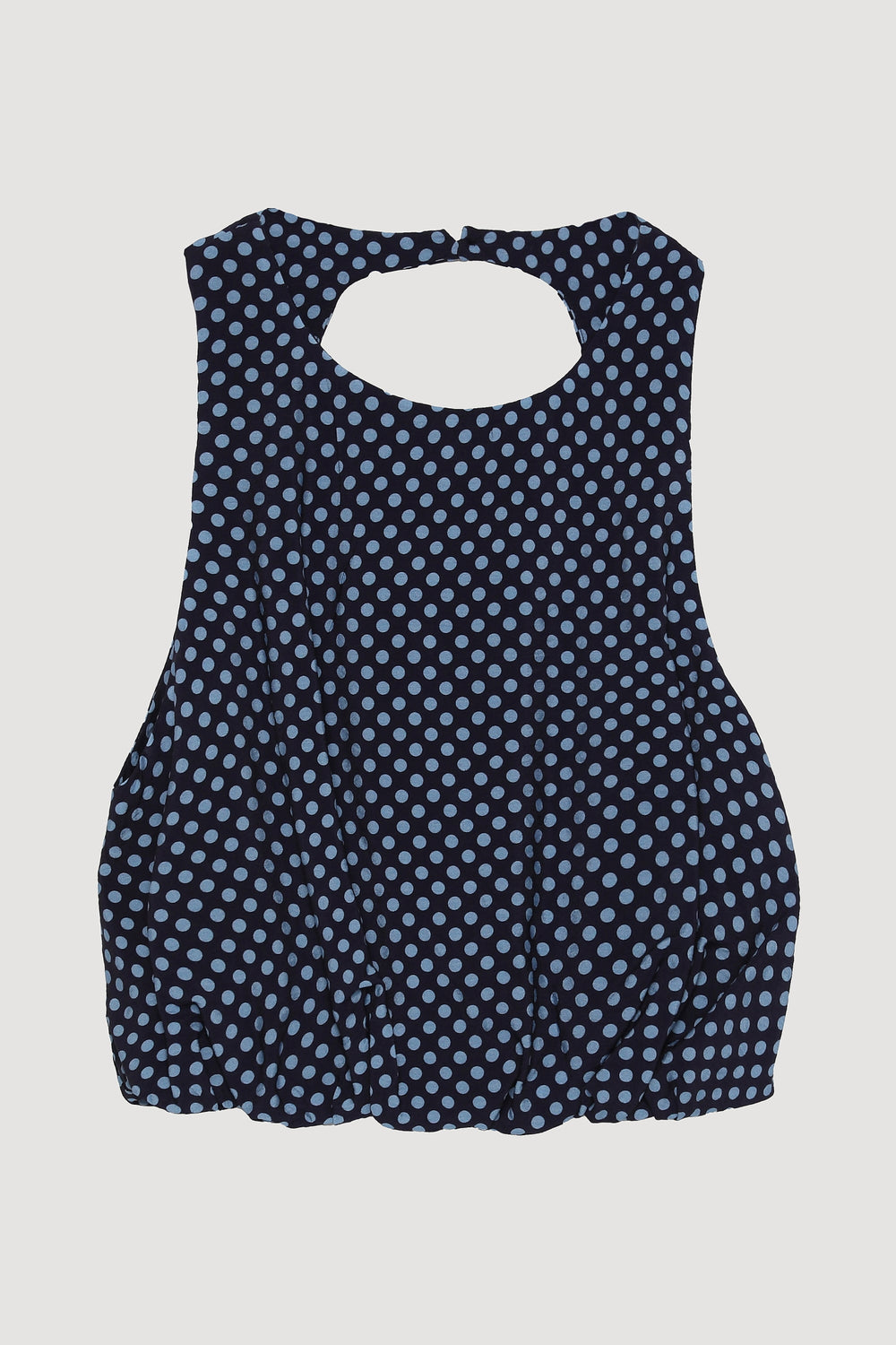 Benek desenli, balon kesim, sırt dekolteli, yuvarlak yaka, içi astarlı, boyundan düğme kapamalı, kolsuz bluz.