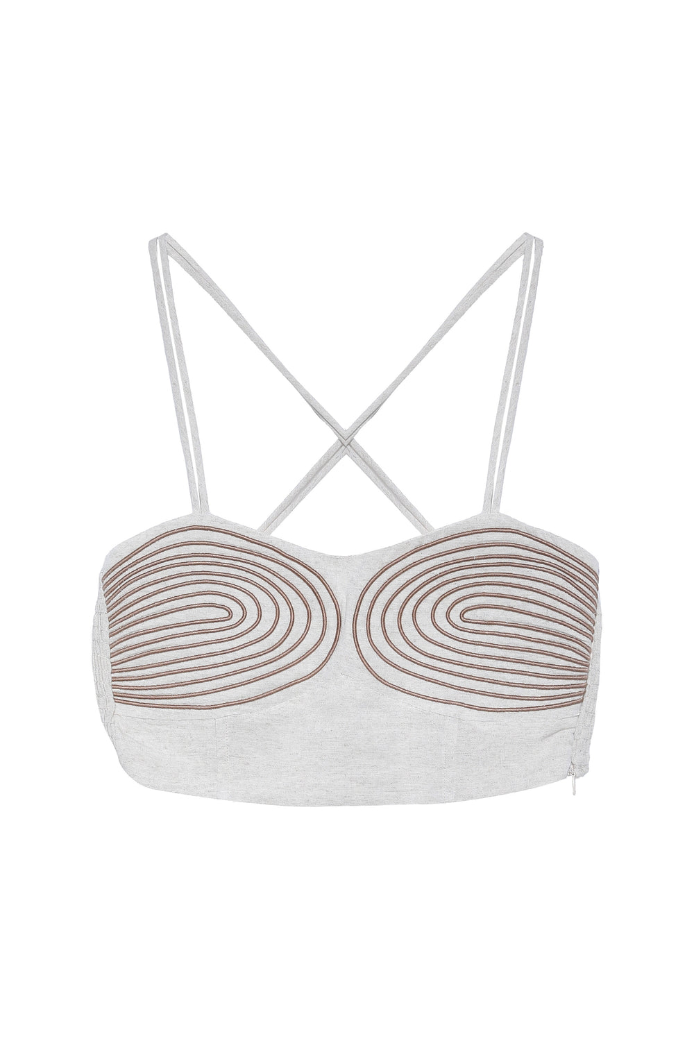 Keten karışımlı, ince askılı, desen detaylı, sırtı çapraz bağlamalı, crop bluz.
