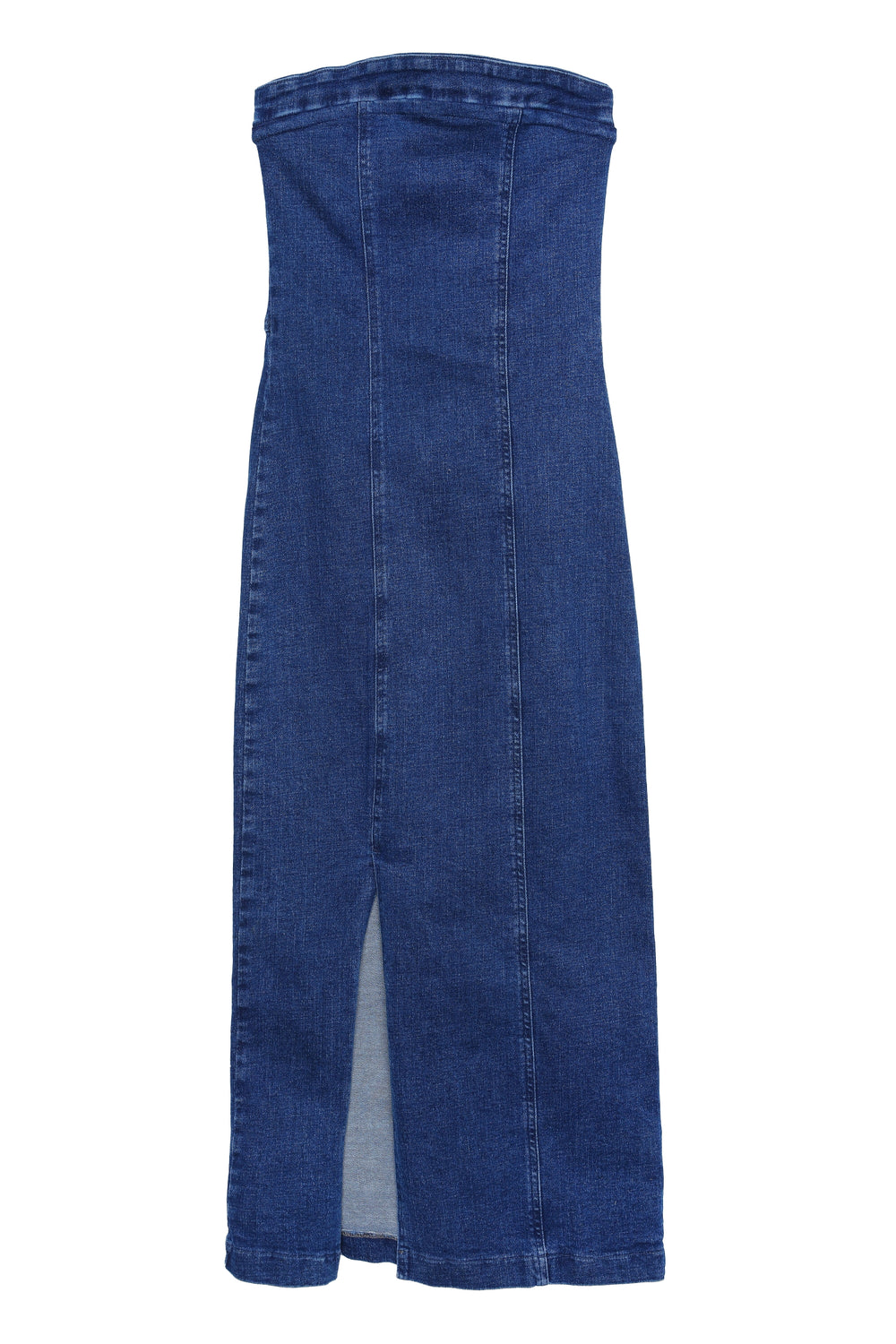 Straplez, önden yırtmaçlı, midi boy kot elbise.