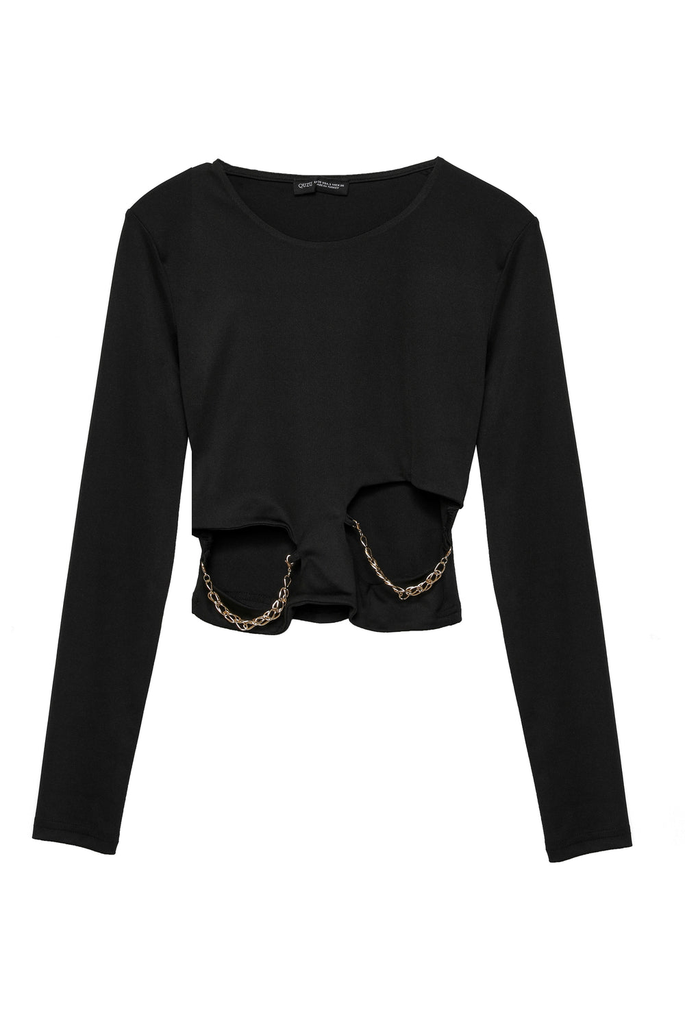 Uzun kollu, bisiklet yaka, cut-out kesim ve zincir detaylı, crop bluz.