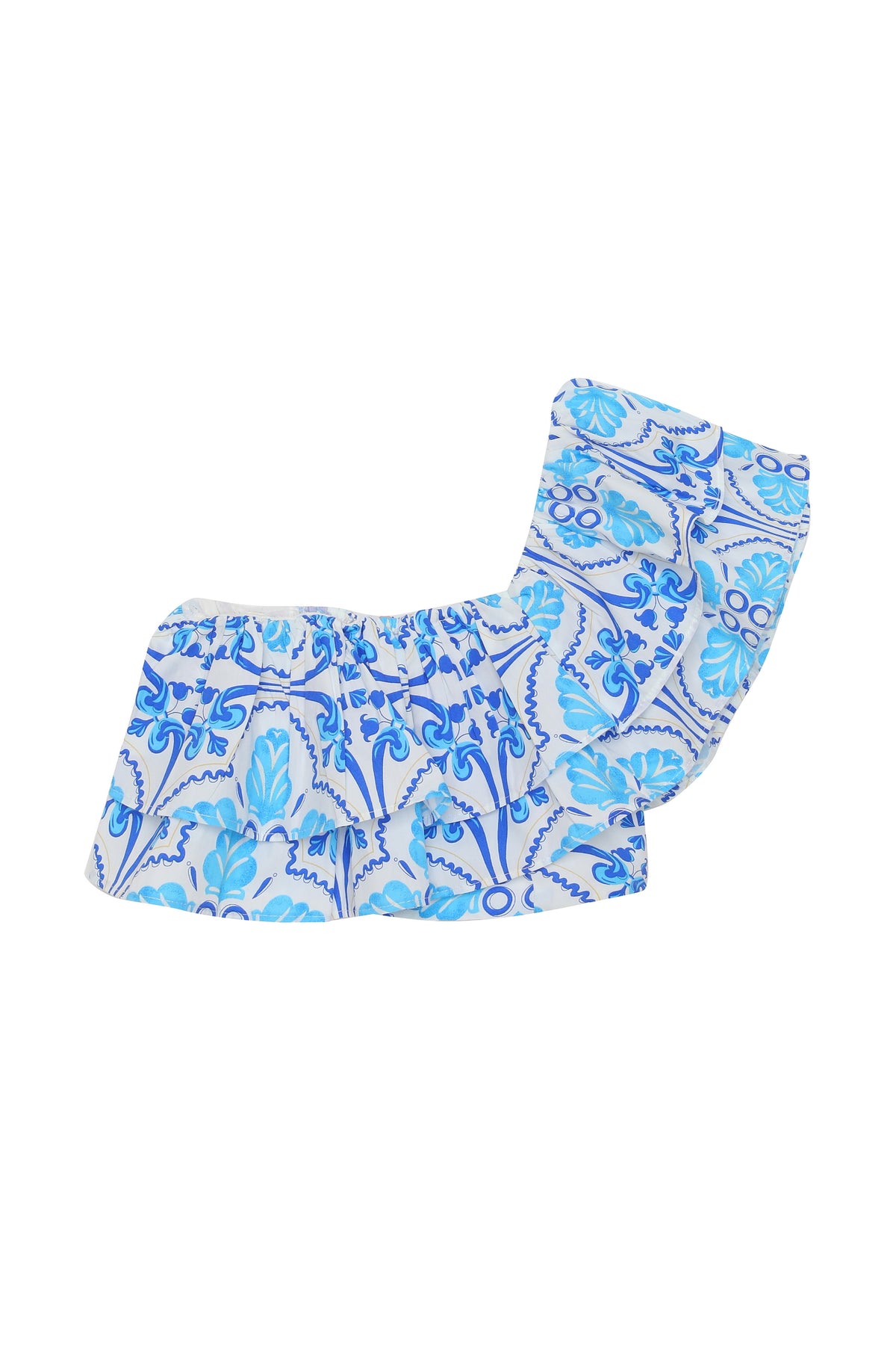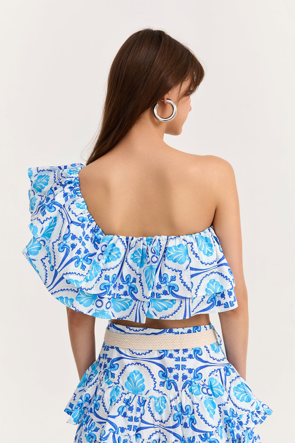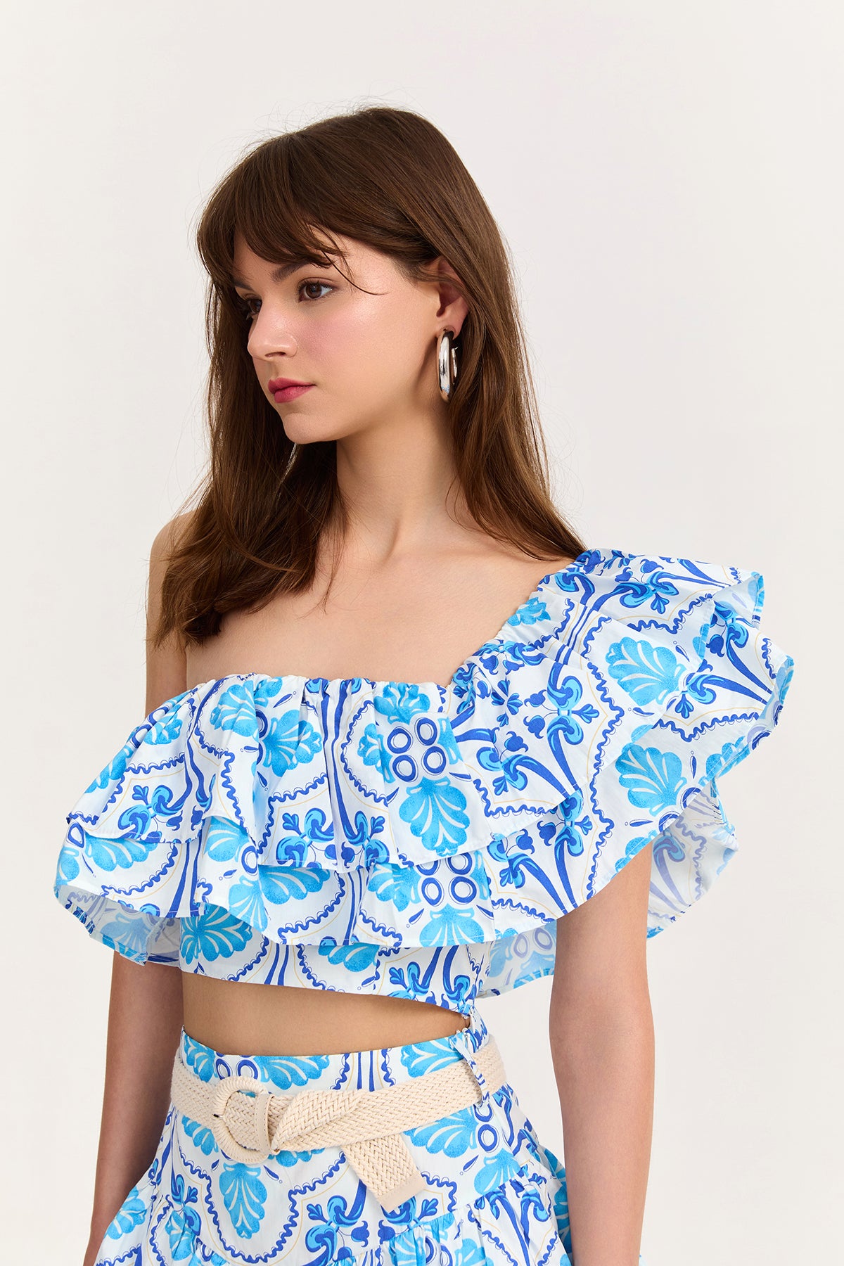Tek omuz detaylı, volanlı, kısa kollu, desenli, crop bluz.