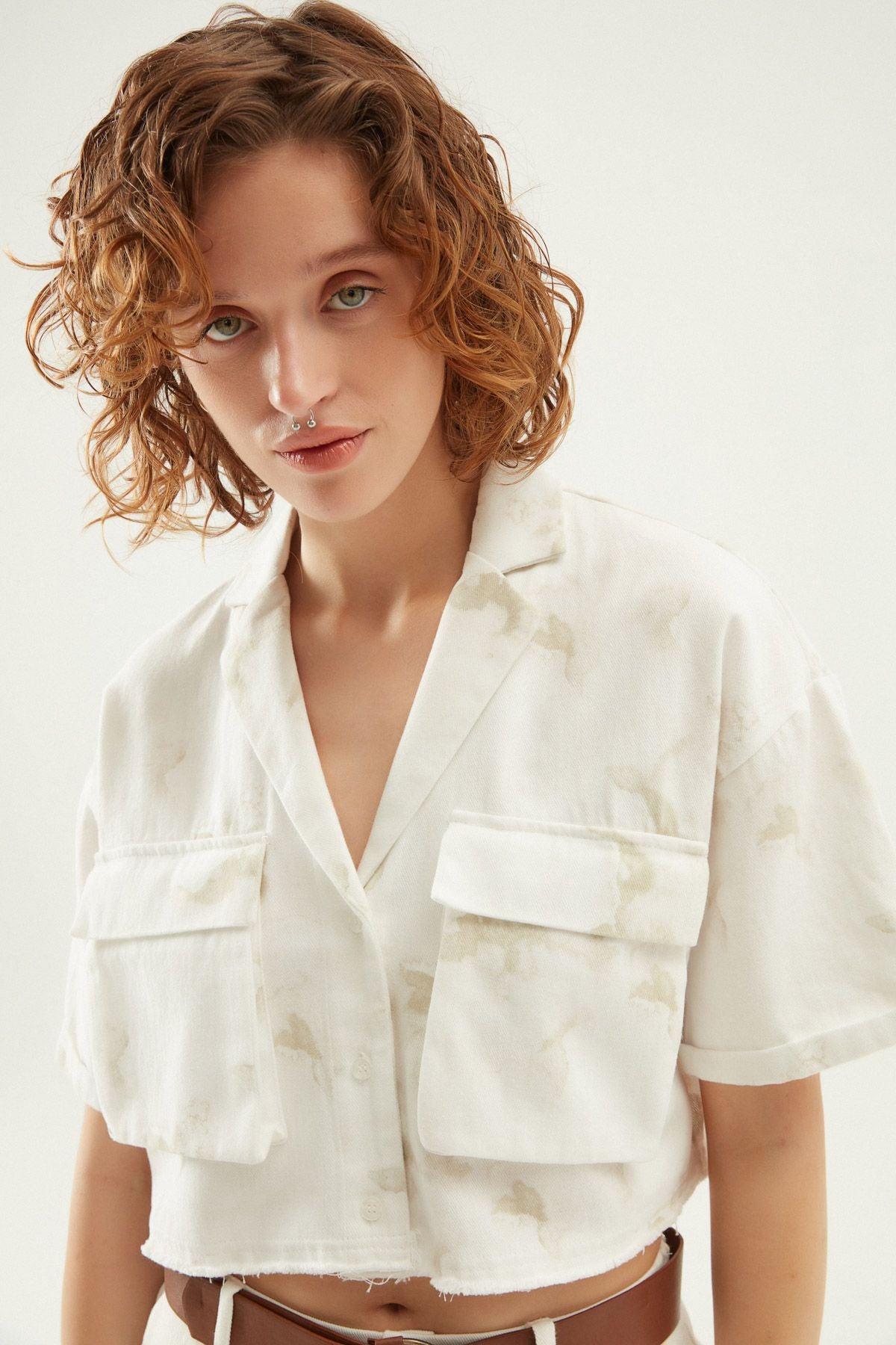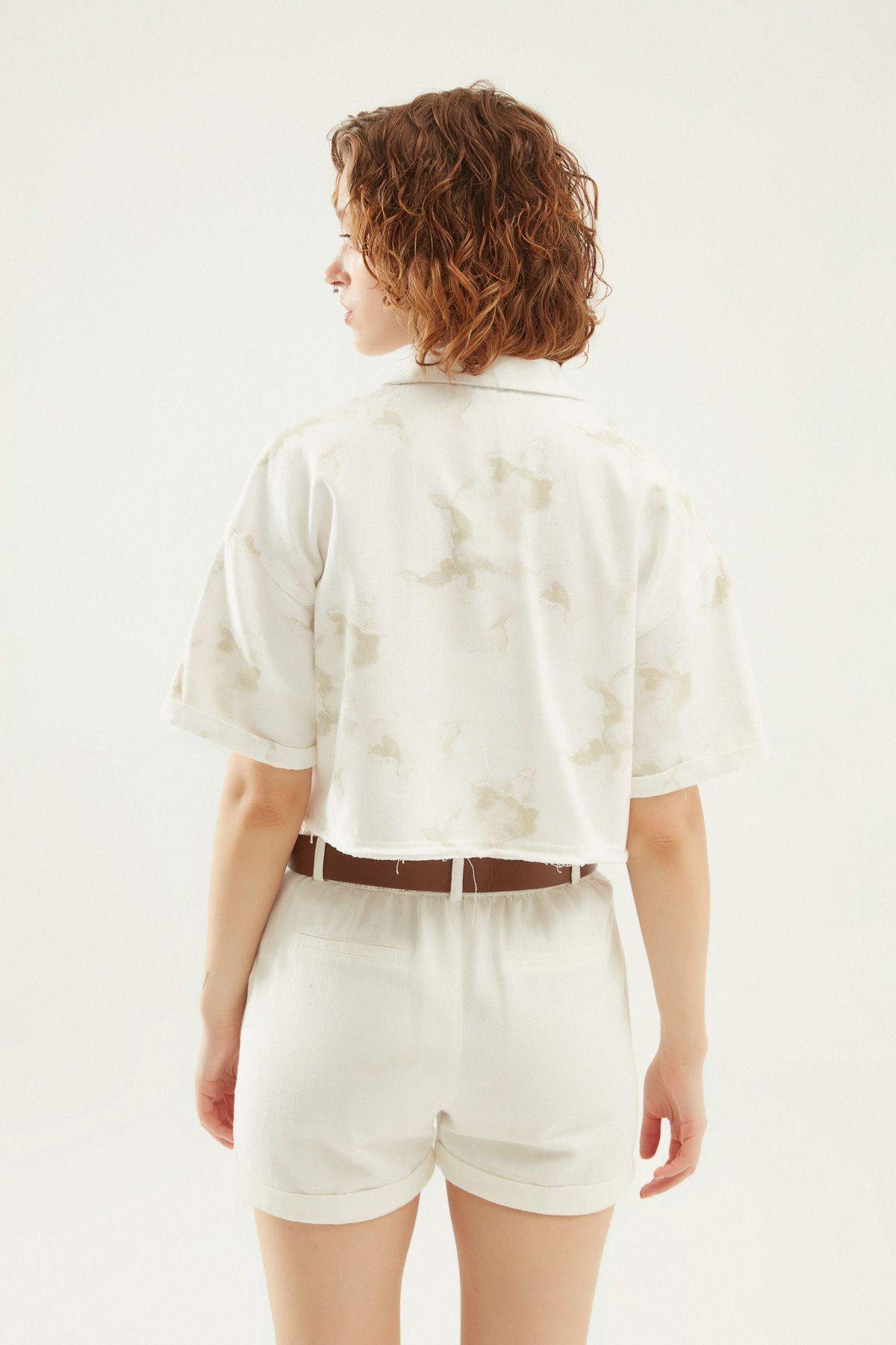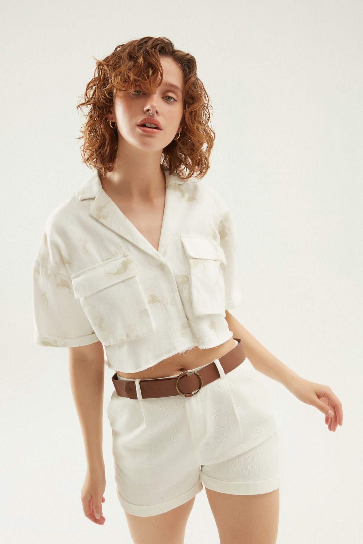 Desenli Cepli Crop Gömlek Beyaz