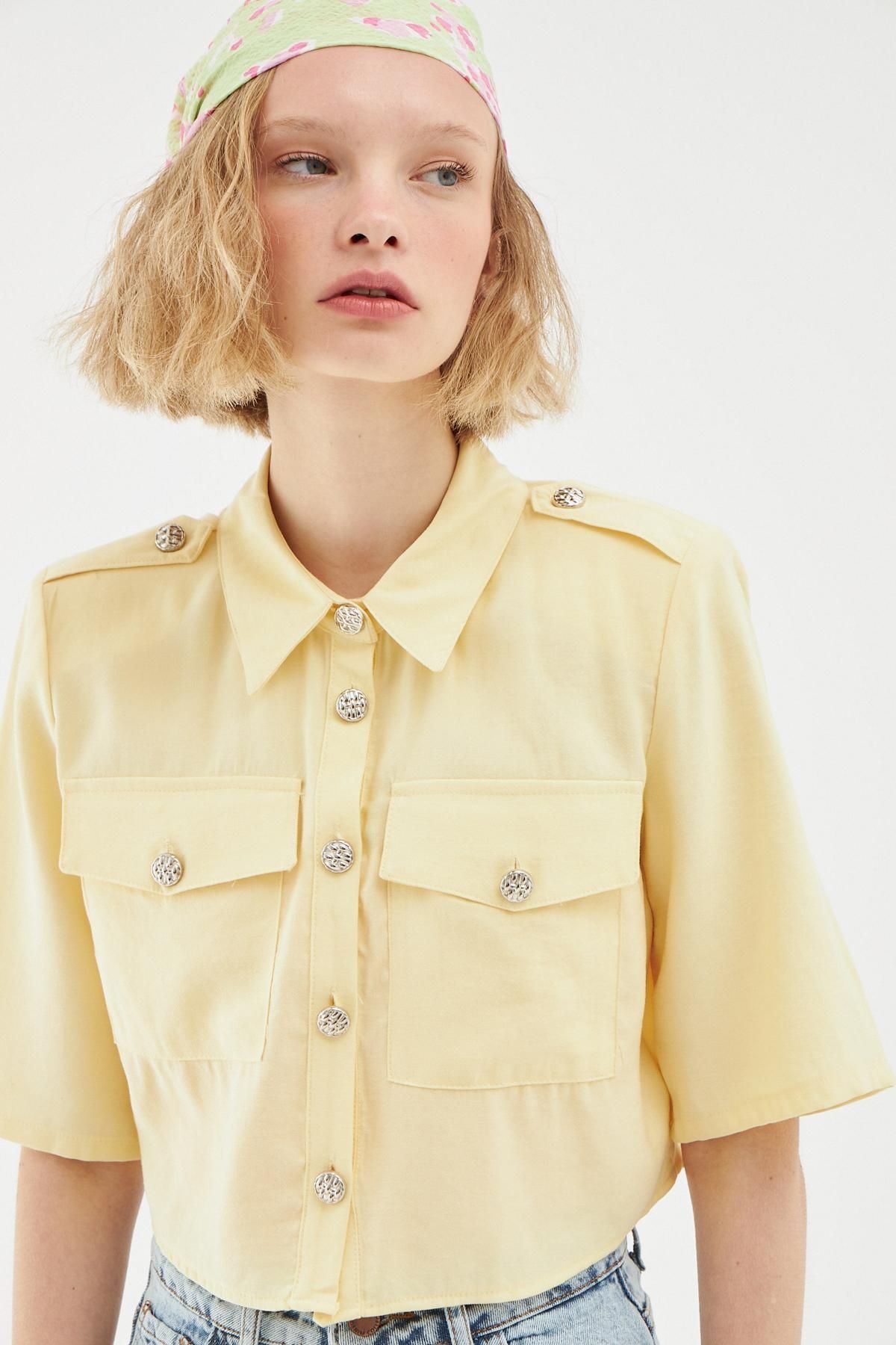 Düğme Detaylı Crop Gömlek Sarı
