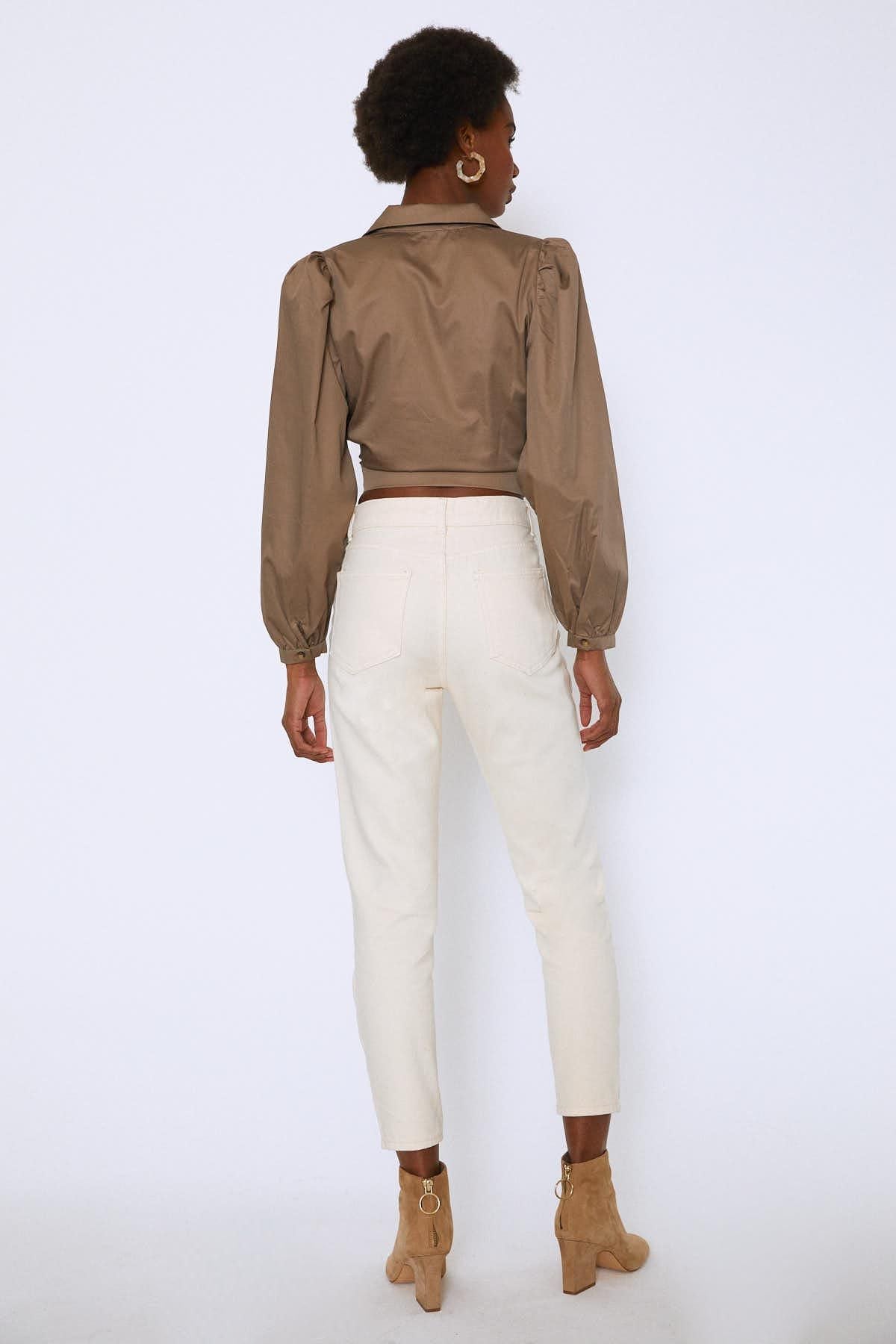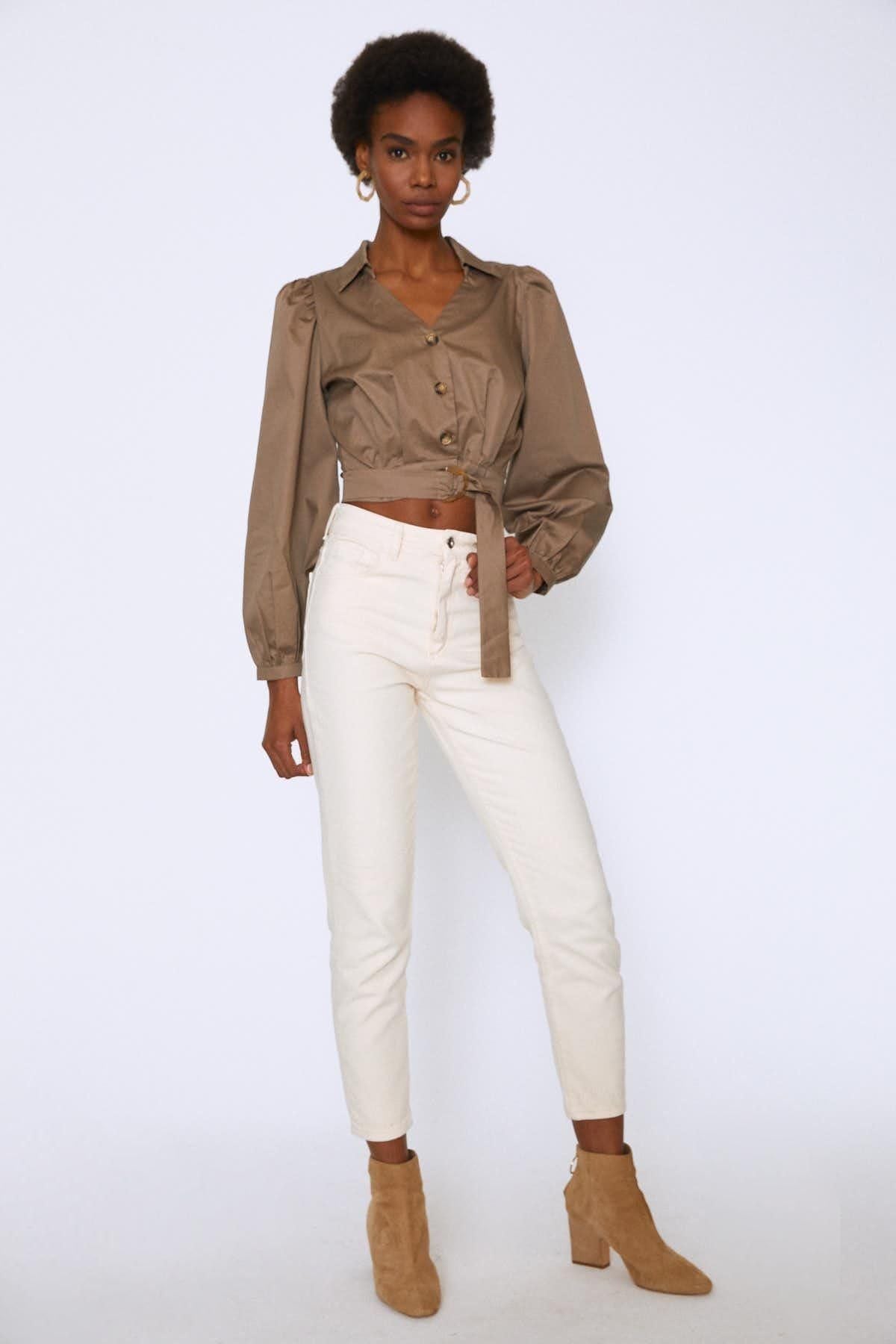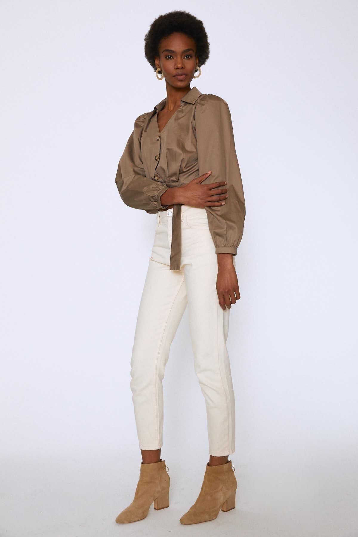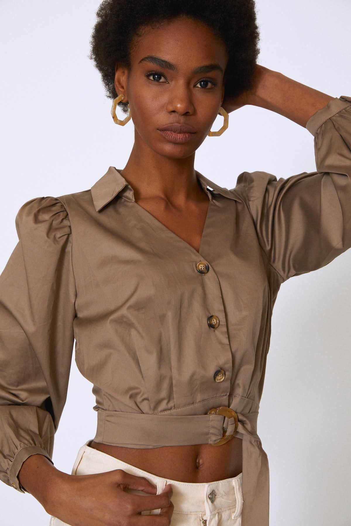 Önü Düğmeli Balon Kol Gömlek Toprak