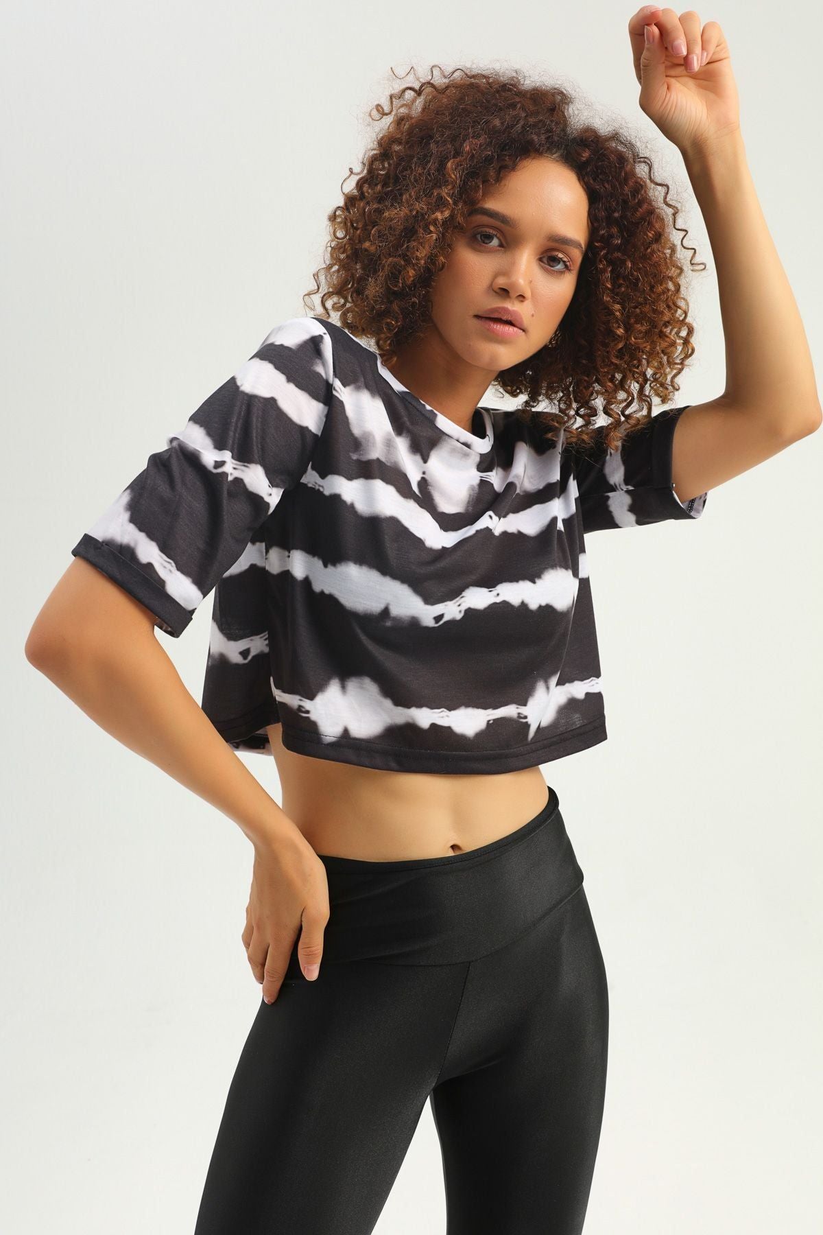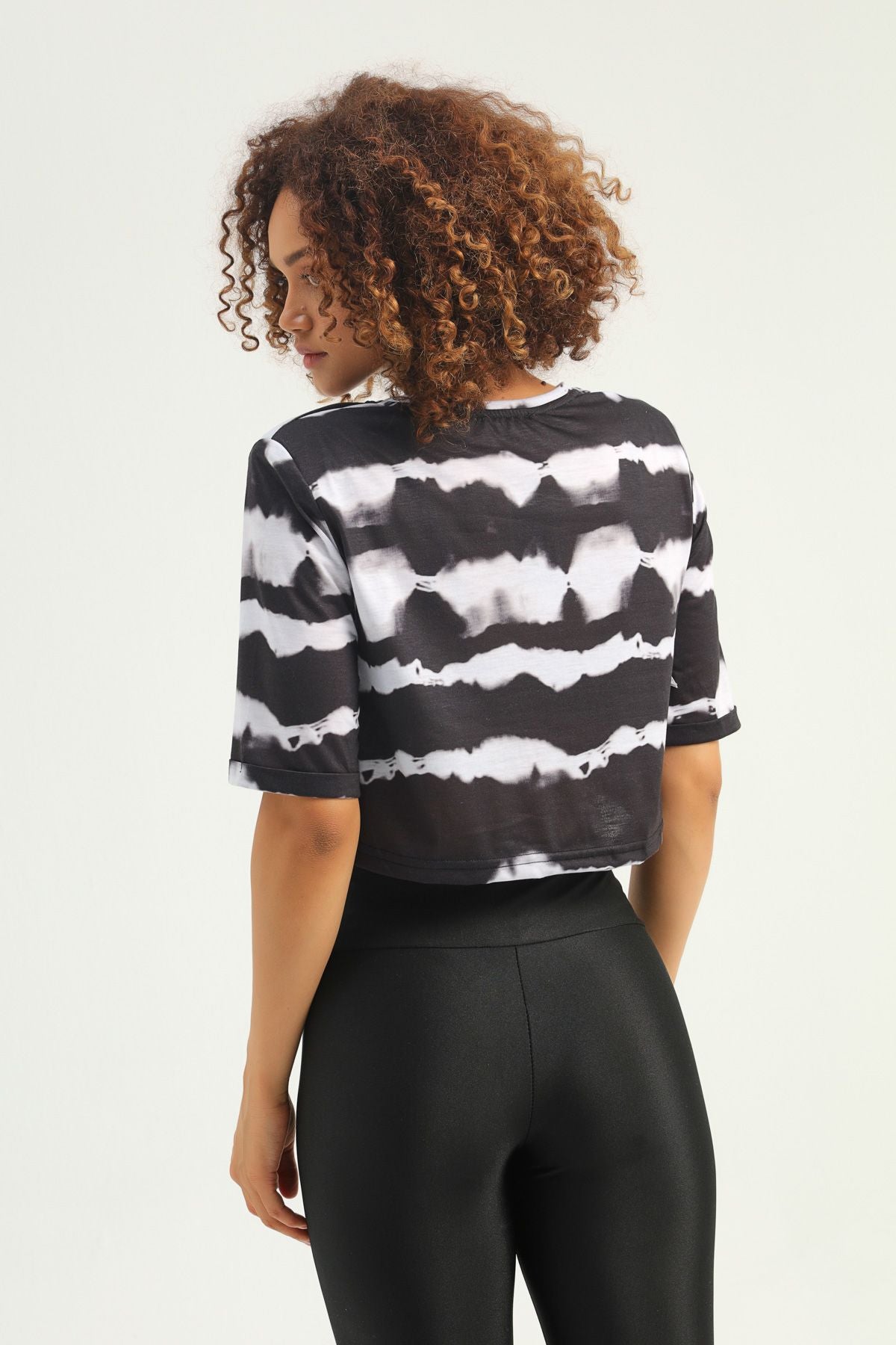 Desenli Vatkalı Crop Tişört Siyah