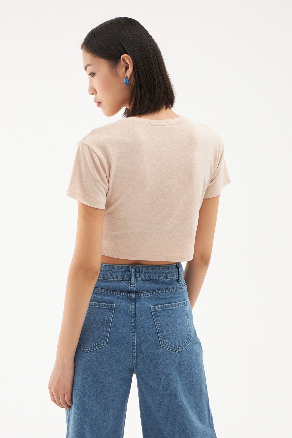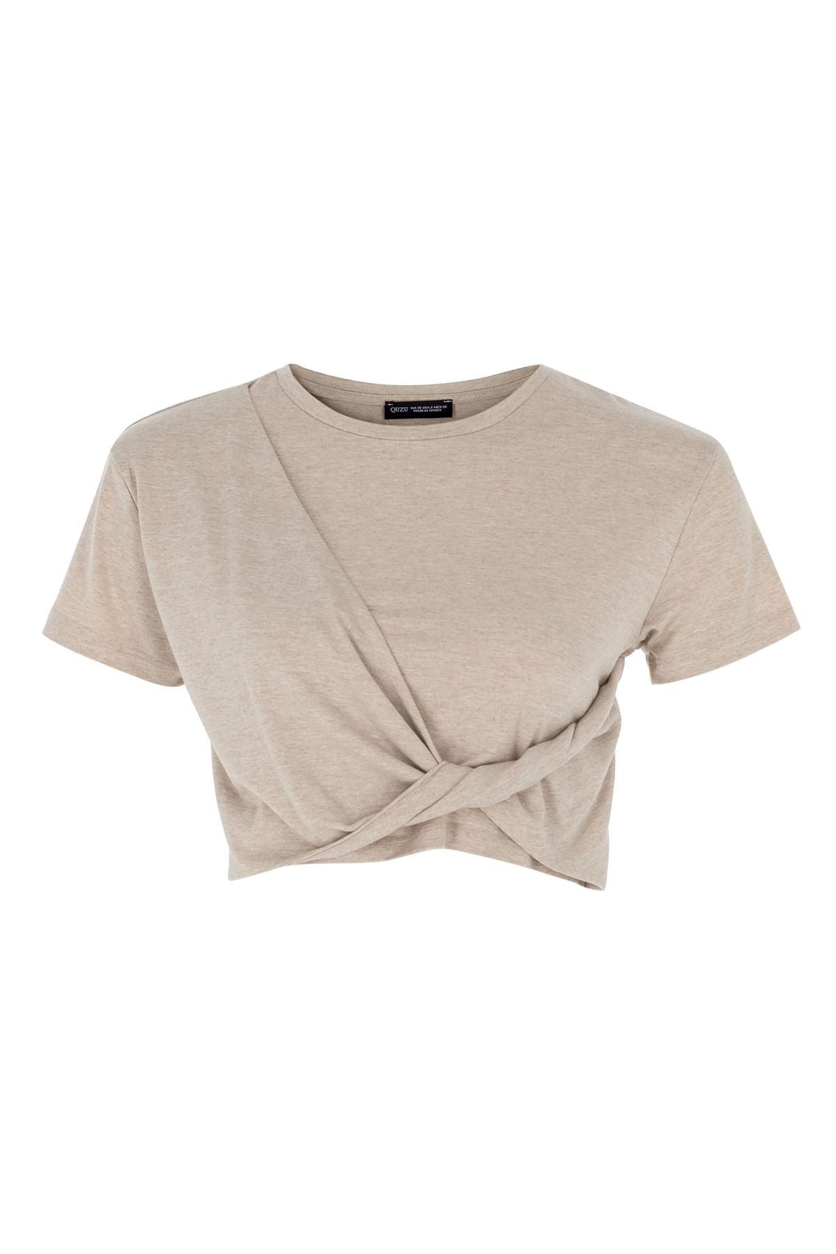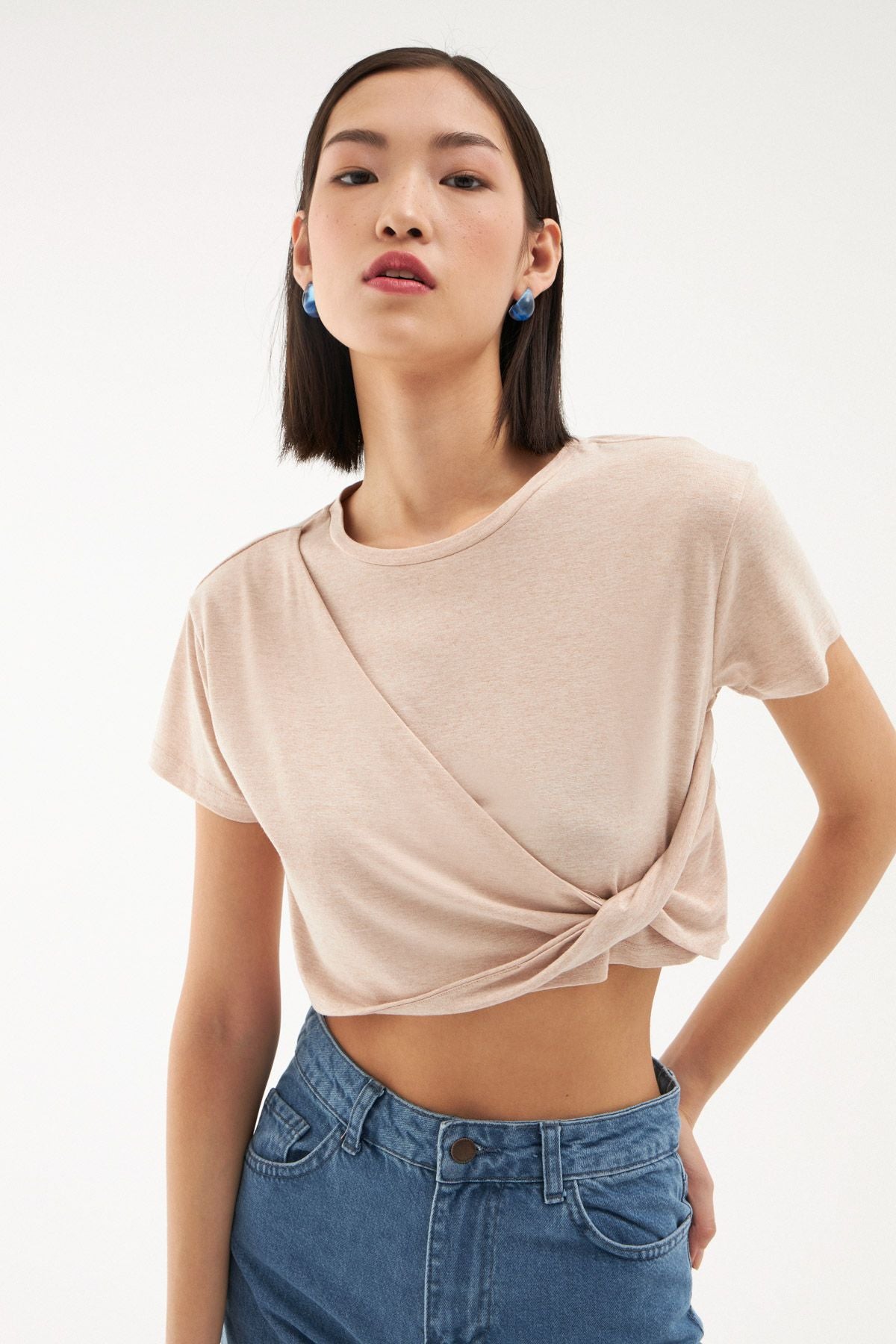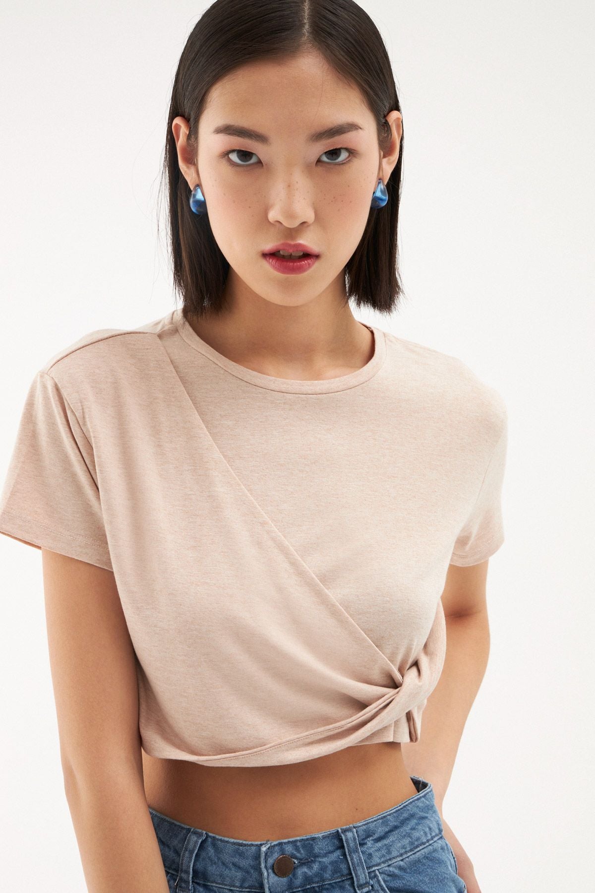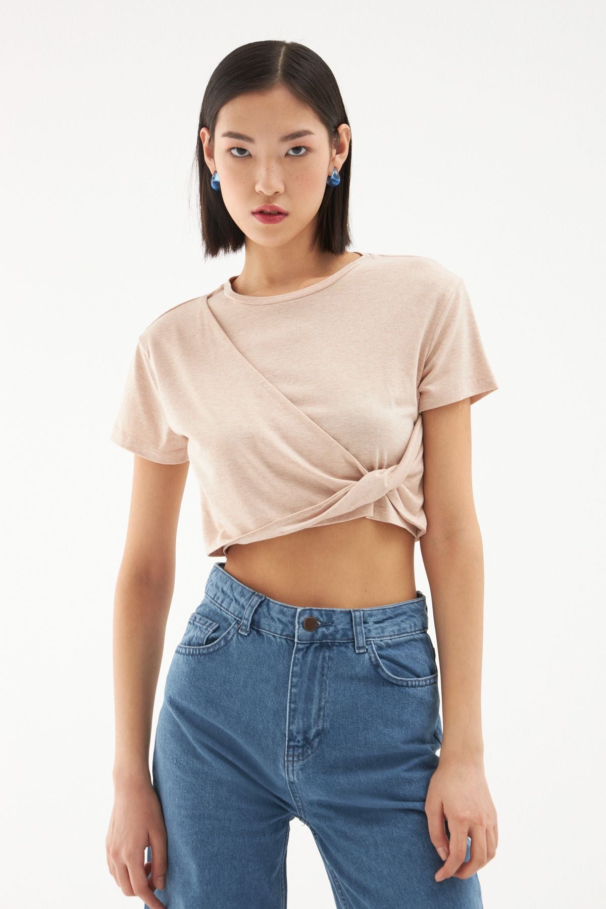 Sırt kısmından ön kısma kadar gelen düğüm detaylı tasarımı ile hoş bir bütünlük kazanan viskon içerikli crop tişört modeli basic kombinlerinin tamamlayıcı parçası olabilir. Sade kombinlerine hareket veren düğüm detaylı crop tişört modeli bisiklet yakadır.