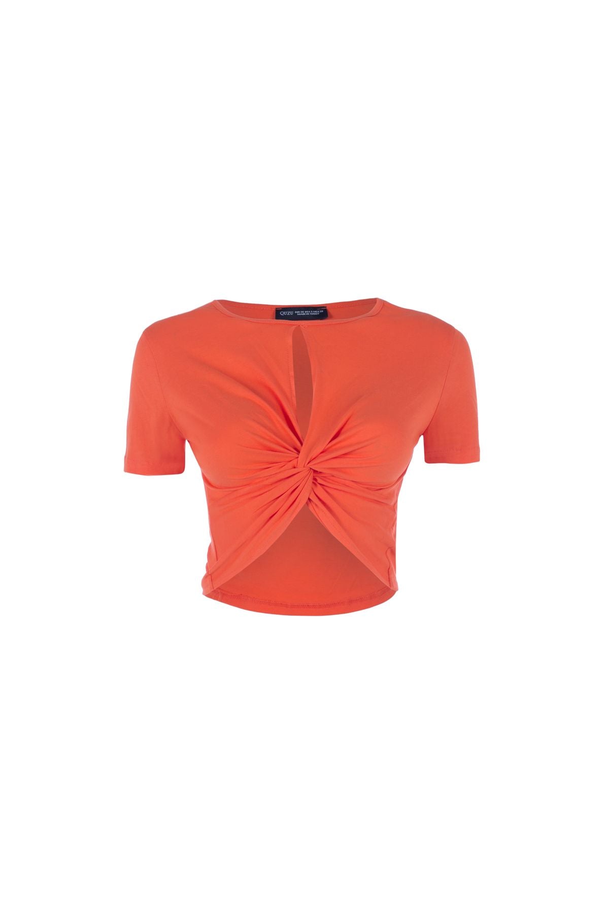 Stil sahibi ve iddialı görünümler için yumuşacık doğal dokulu tişörte bir şans vermeye ne dersin? İster günlük kombinlerinde, istersen de arkadaş buluşmalarında tercih edebileceğin düğüm detaylı crop tişört modelini mom fit pantolonlarla ya da skinny jean’inle birleştirebilirsin. Kombinini ince biyeli topuklu terliklerle tamamlayarak iddialı görünümler yakalayabilirsin.