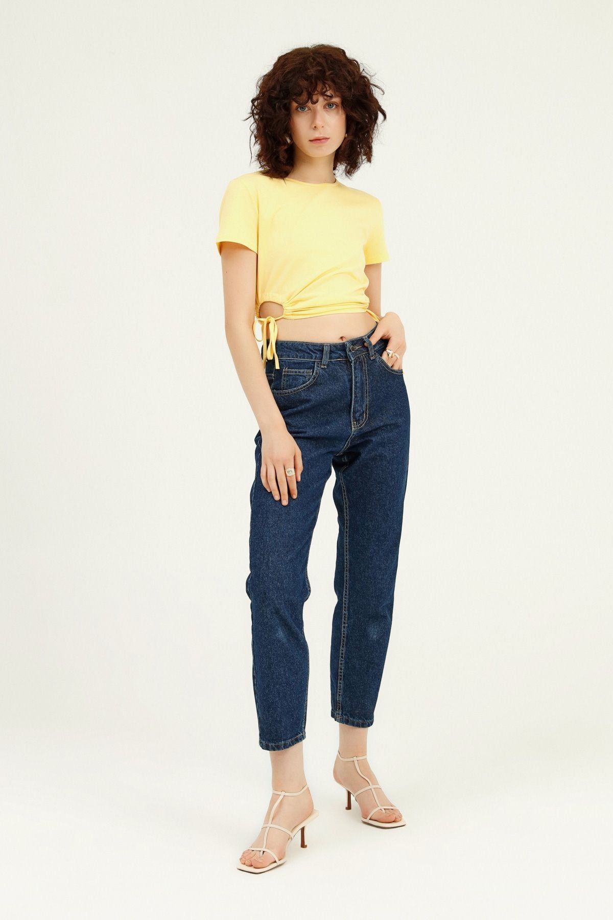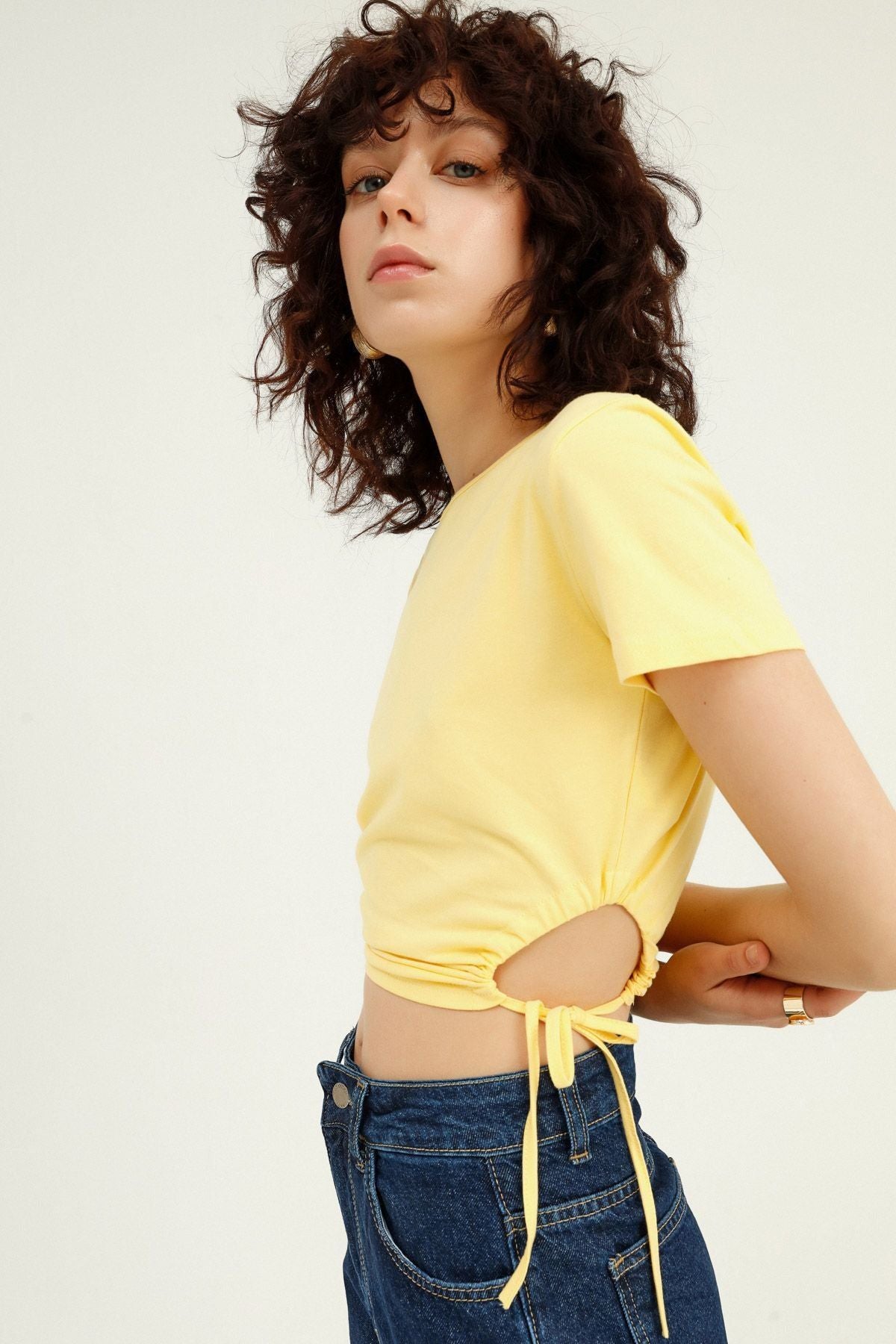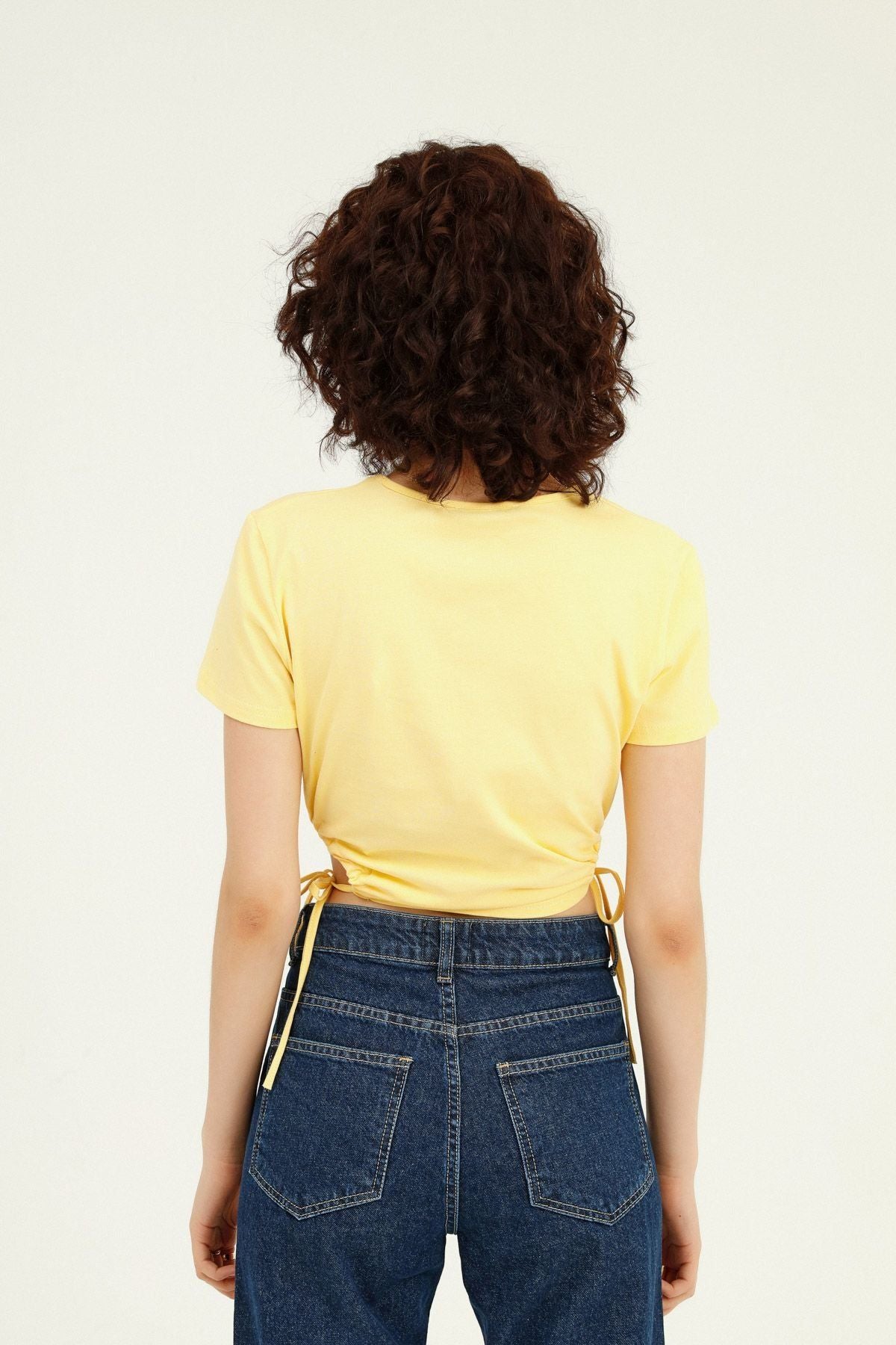 Yanları Büzgülü Dekolteli Tişört Sarı