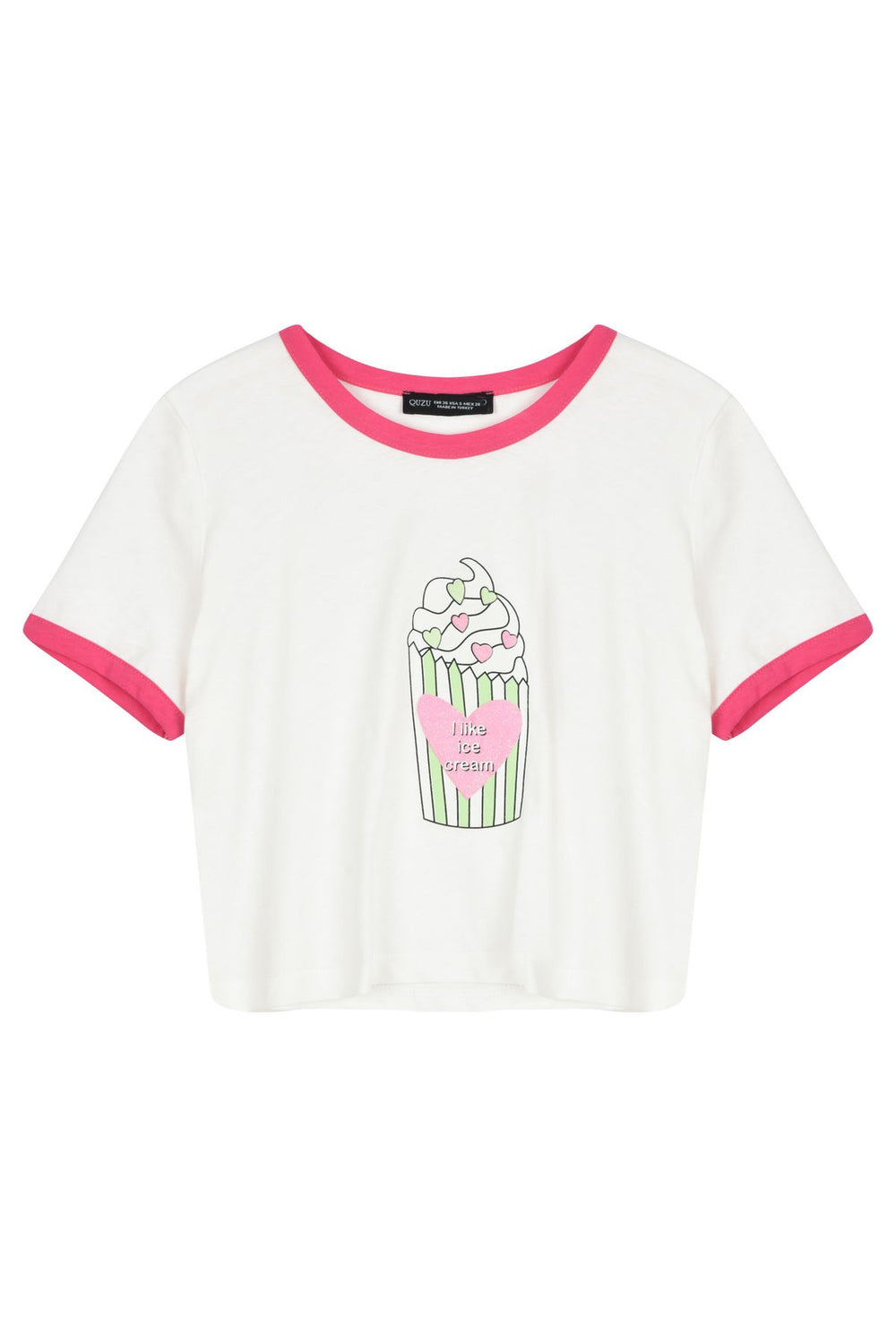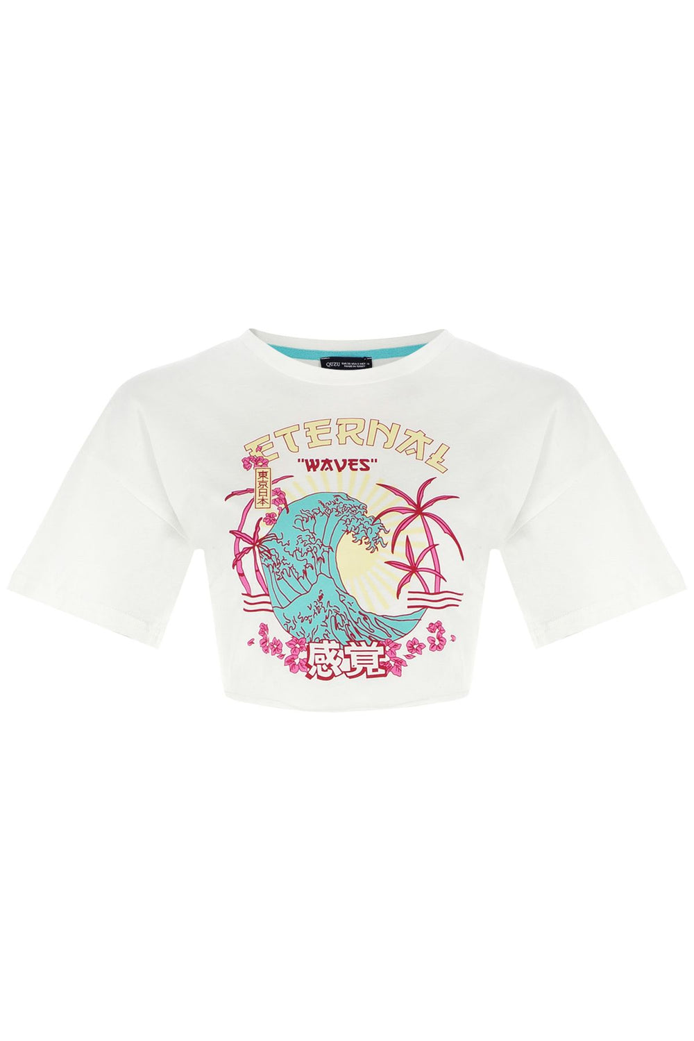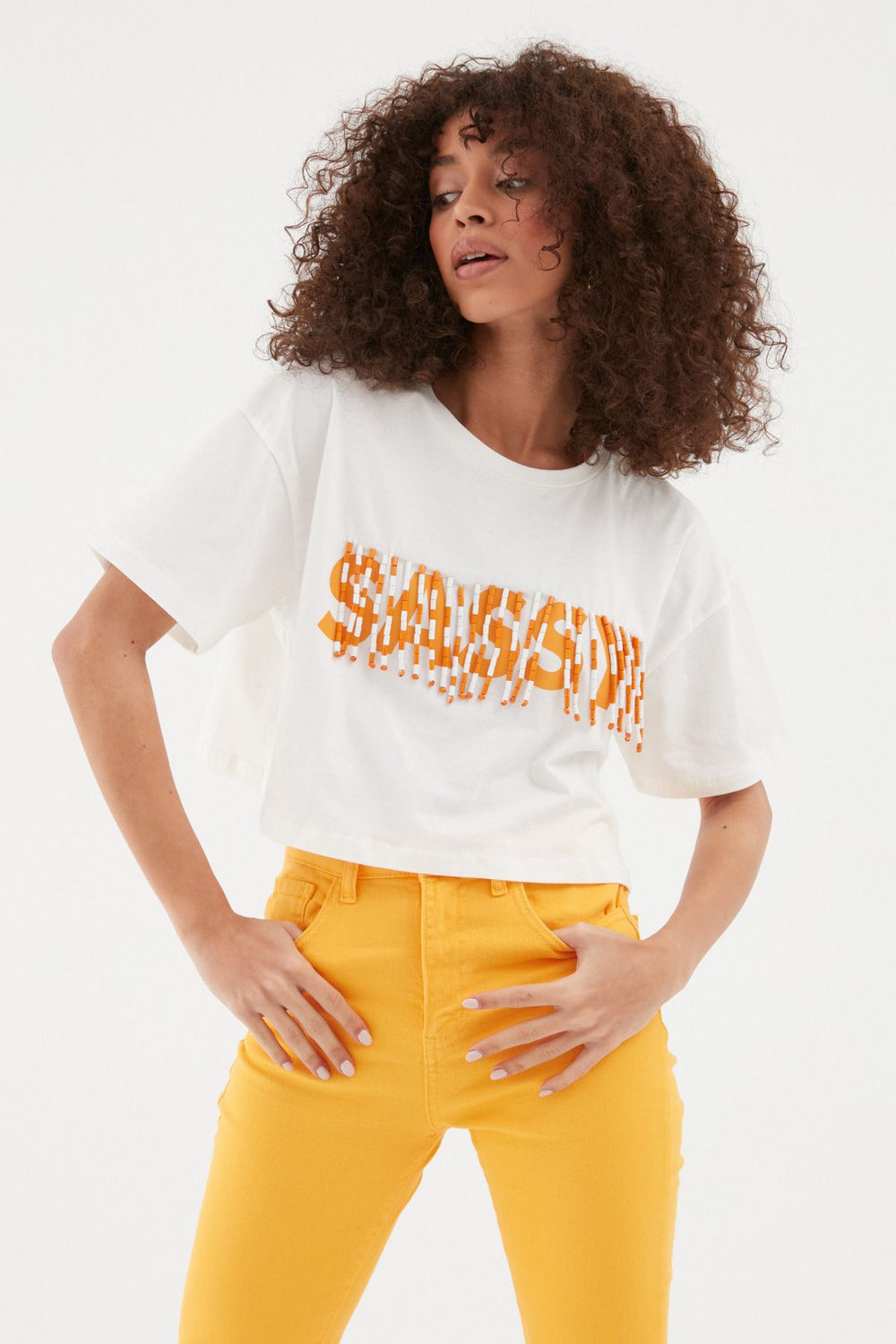 Baskı Detaylı Fitilli Crop Tişört Ekru