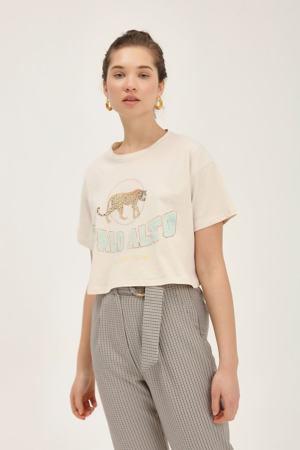 Baskılı Crop Tişört Bej