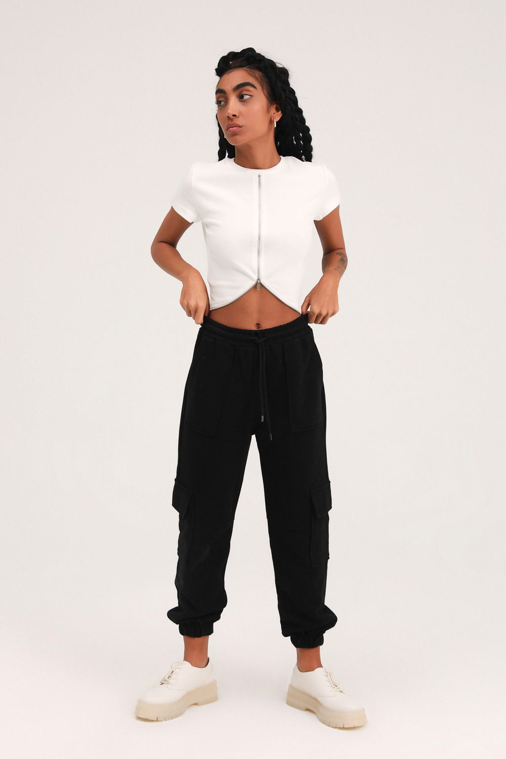Fermuarlı Crop Tişört Beyaz