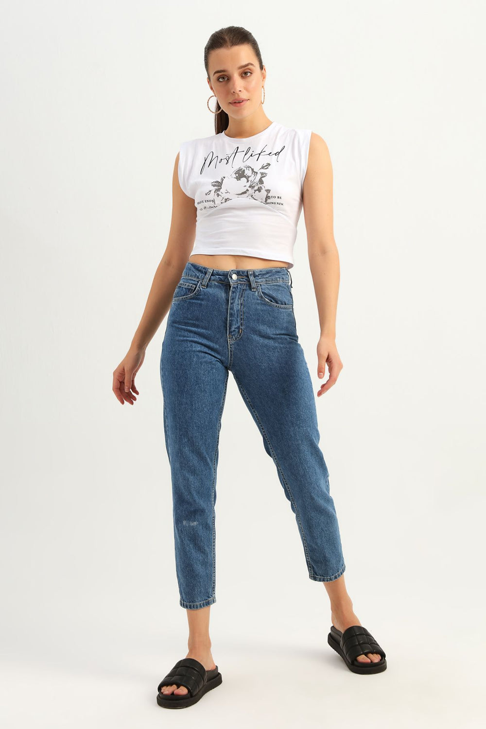 Baskılı Kolsuz Crop Tişört Beyaz