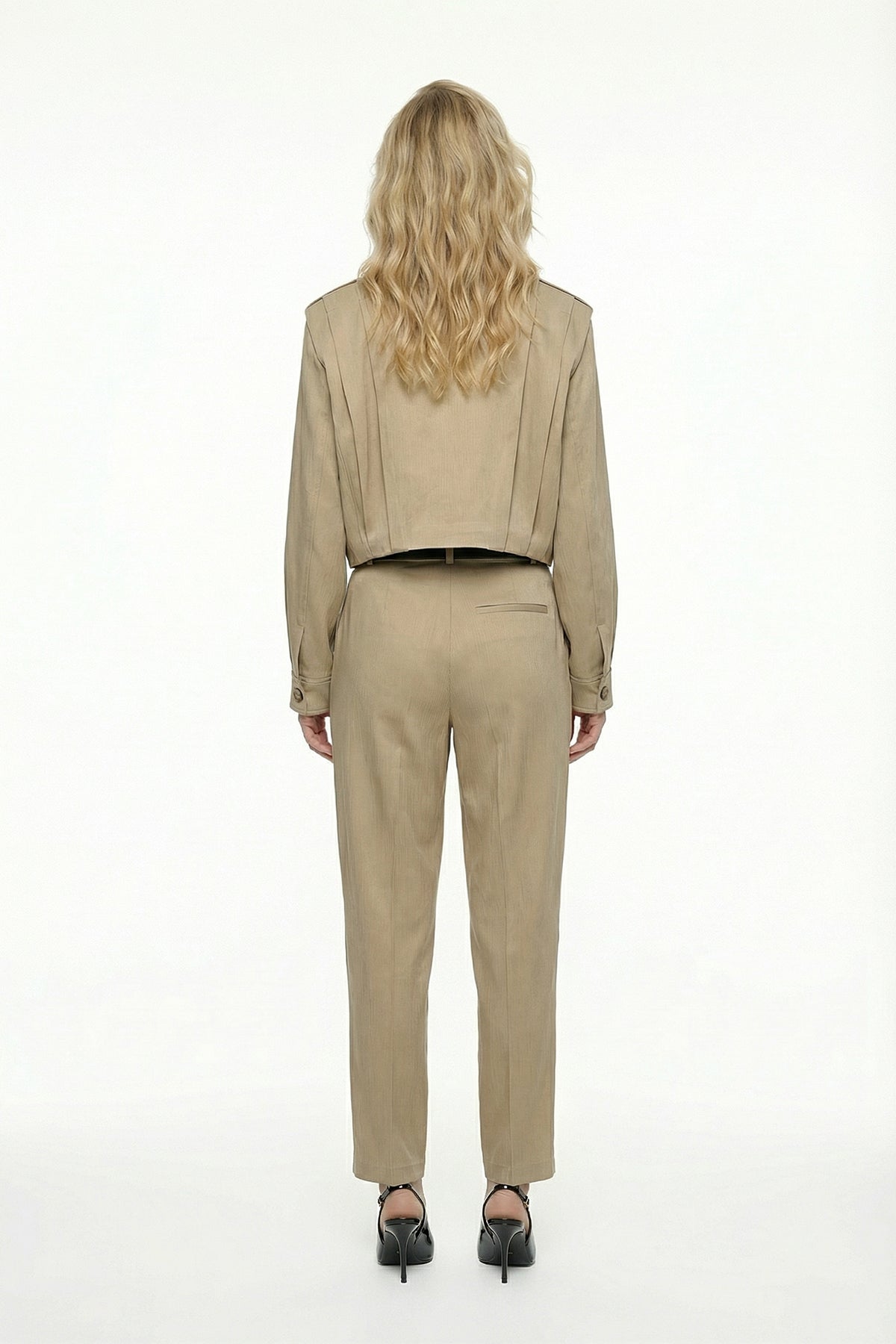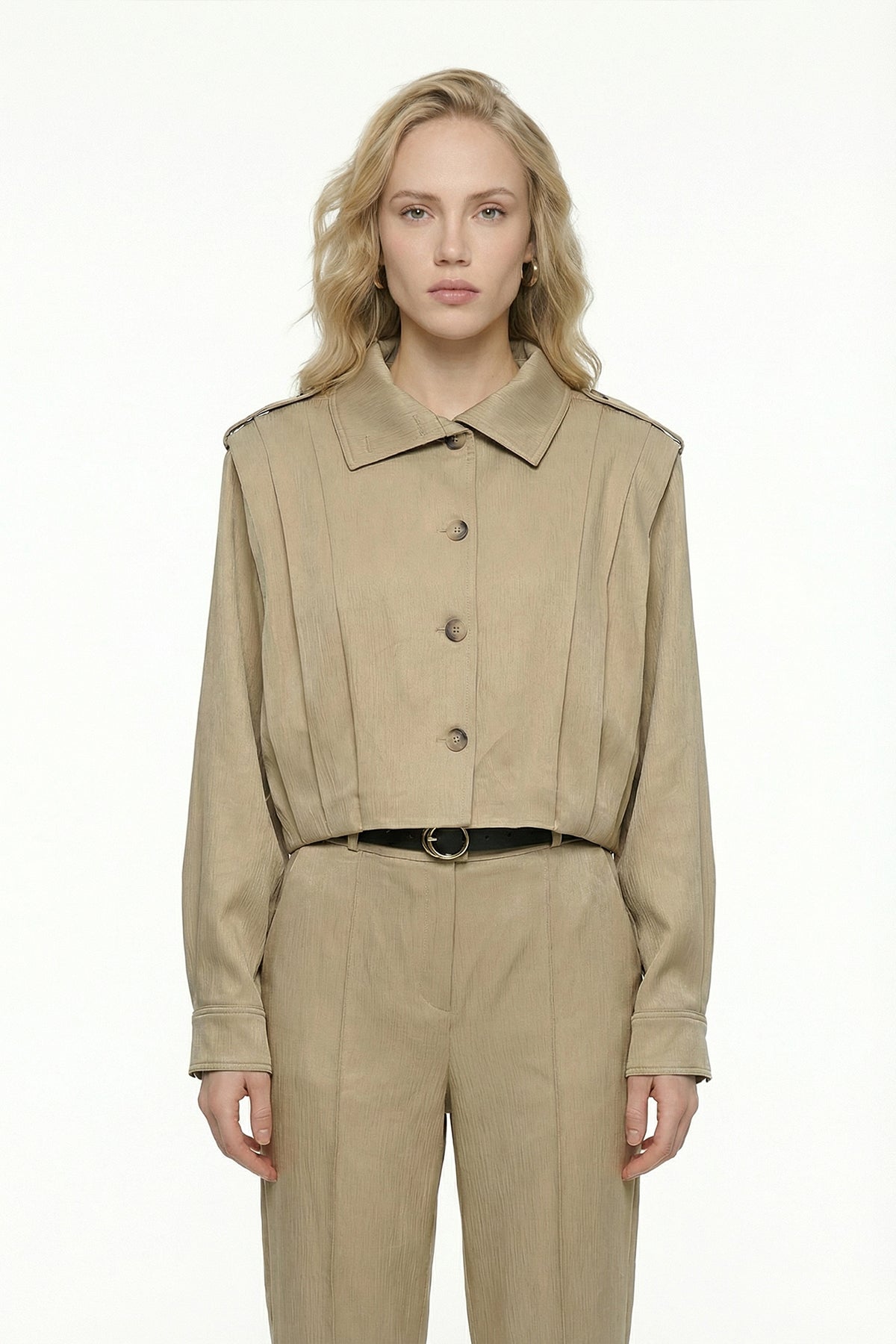 Dik yaka formda, apolet görünümlü, pile detaylı, düğme kapamalı, cepsiz, astarlı, uzun kollu, kısa ceket.