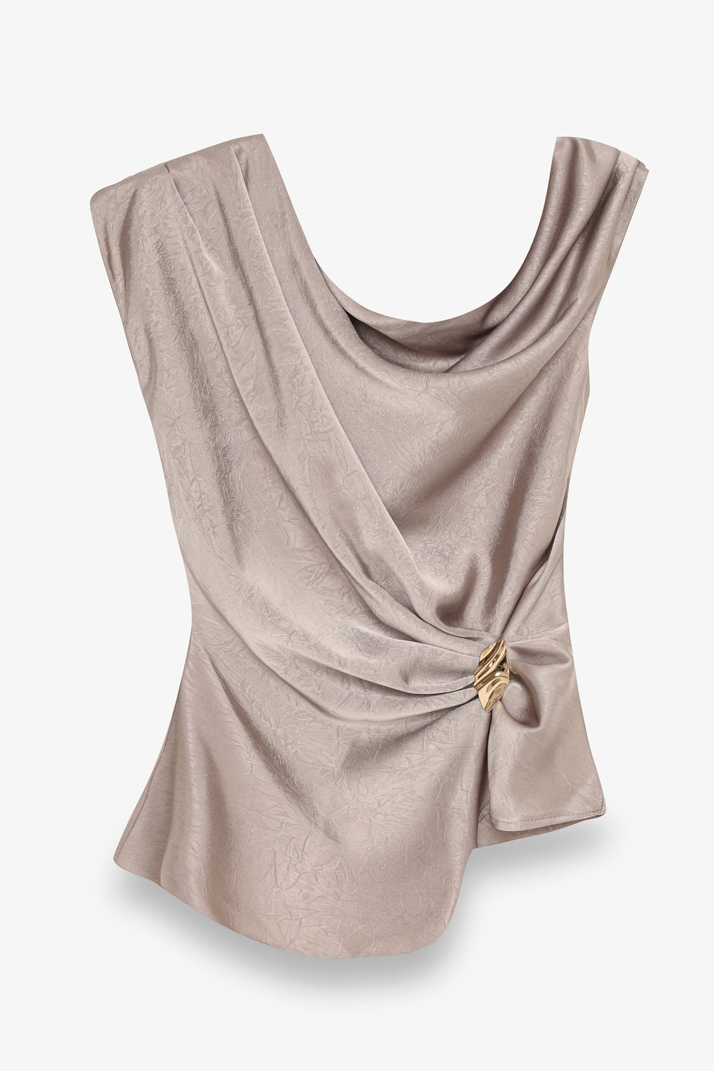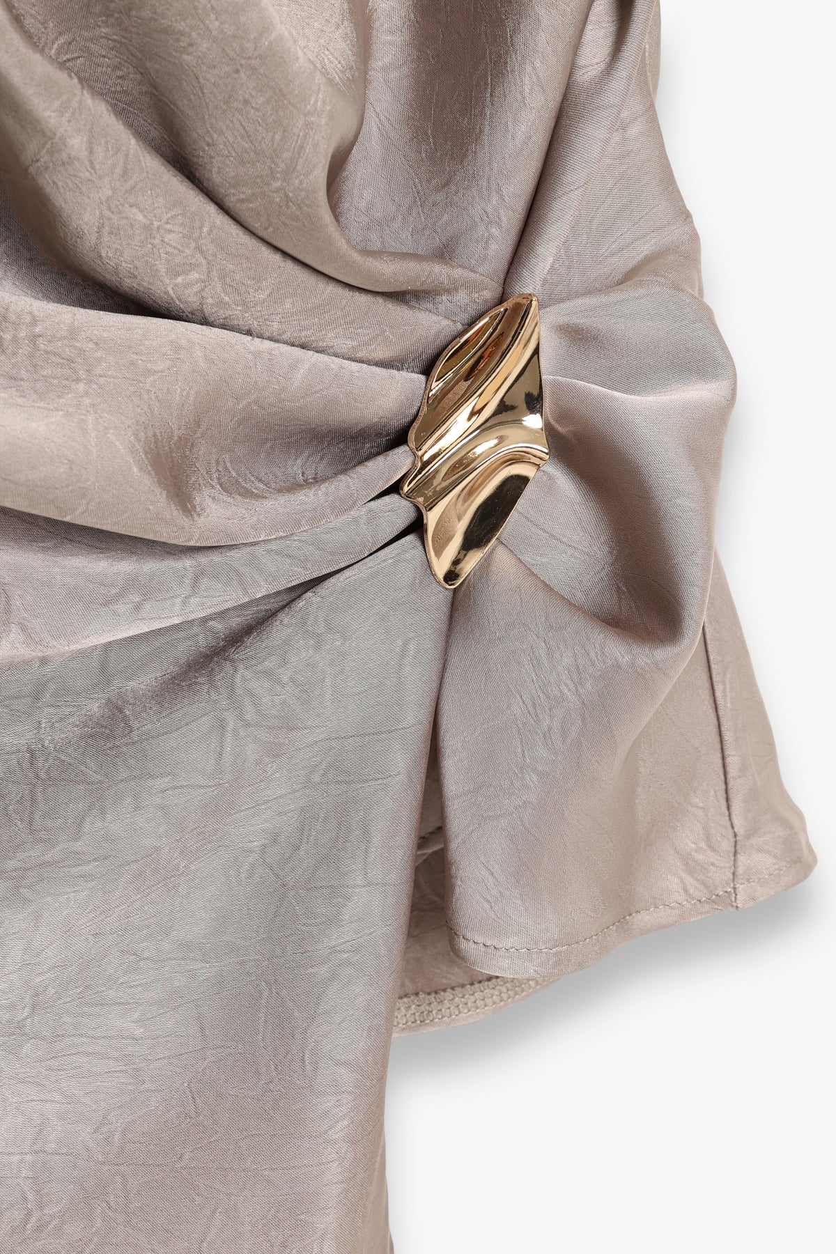 Asimetrik Drapeli Aksesuarlı Saten Bluz Vizon