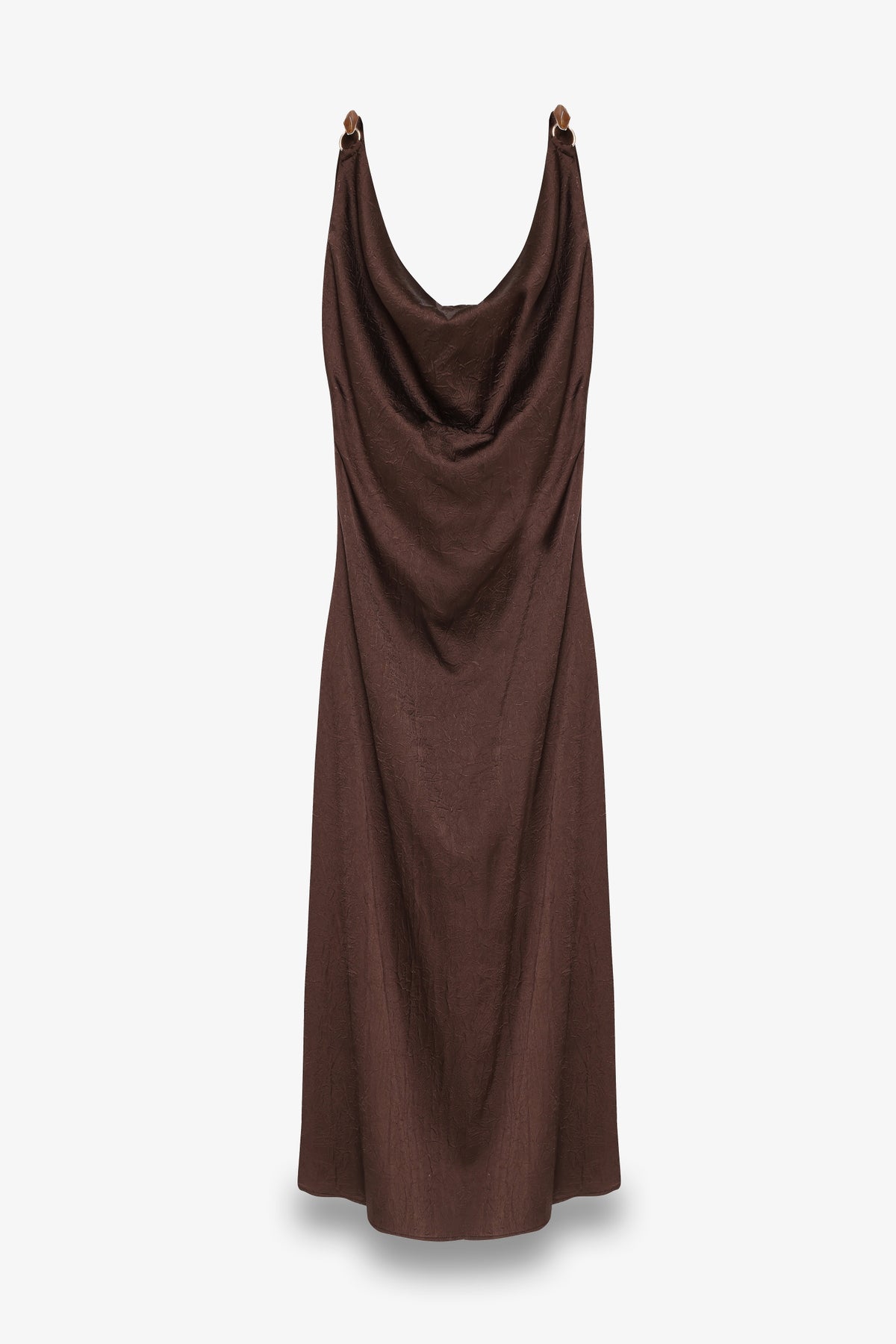 Degaje yaka, halka detay aksesuar askılı, yandan fermuar kapamalı, astarsız, sırtı dekolte ve bağlama detaylı, midi boy elbise.