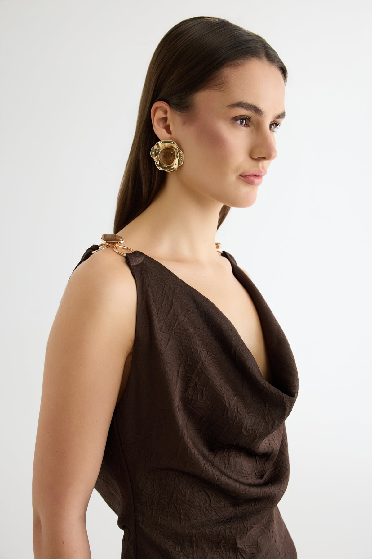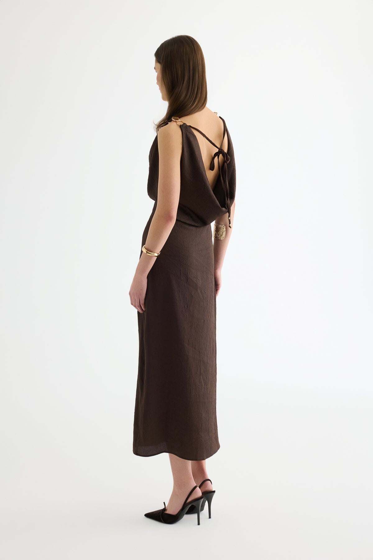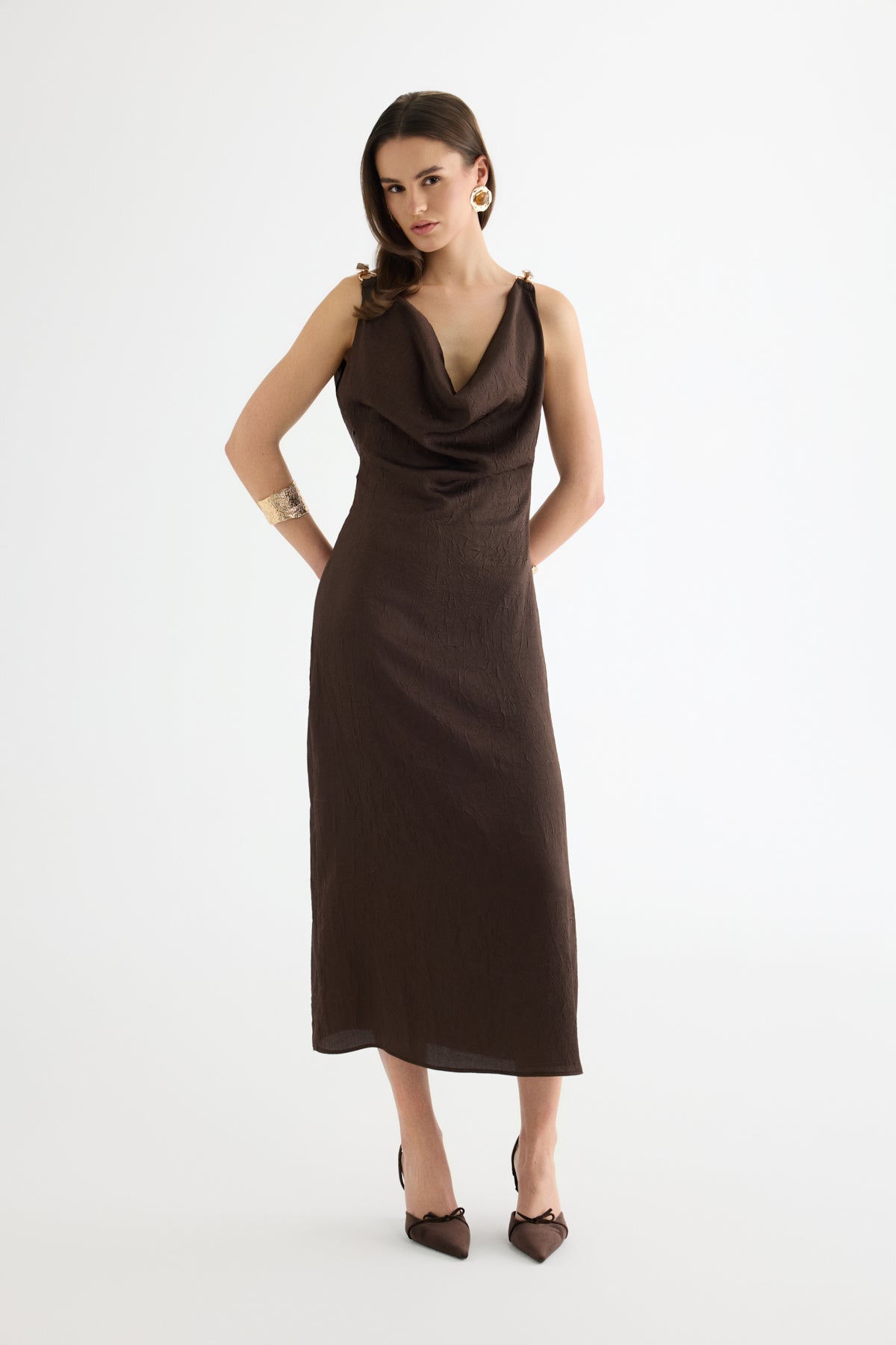 Sırt Bağlamalı Degaje Yaka Midi Elbise Kahverengi