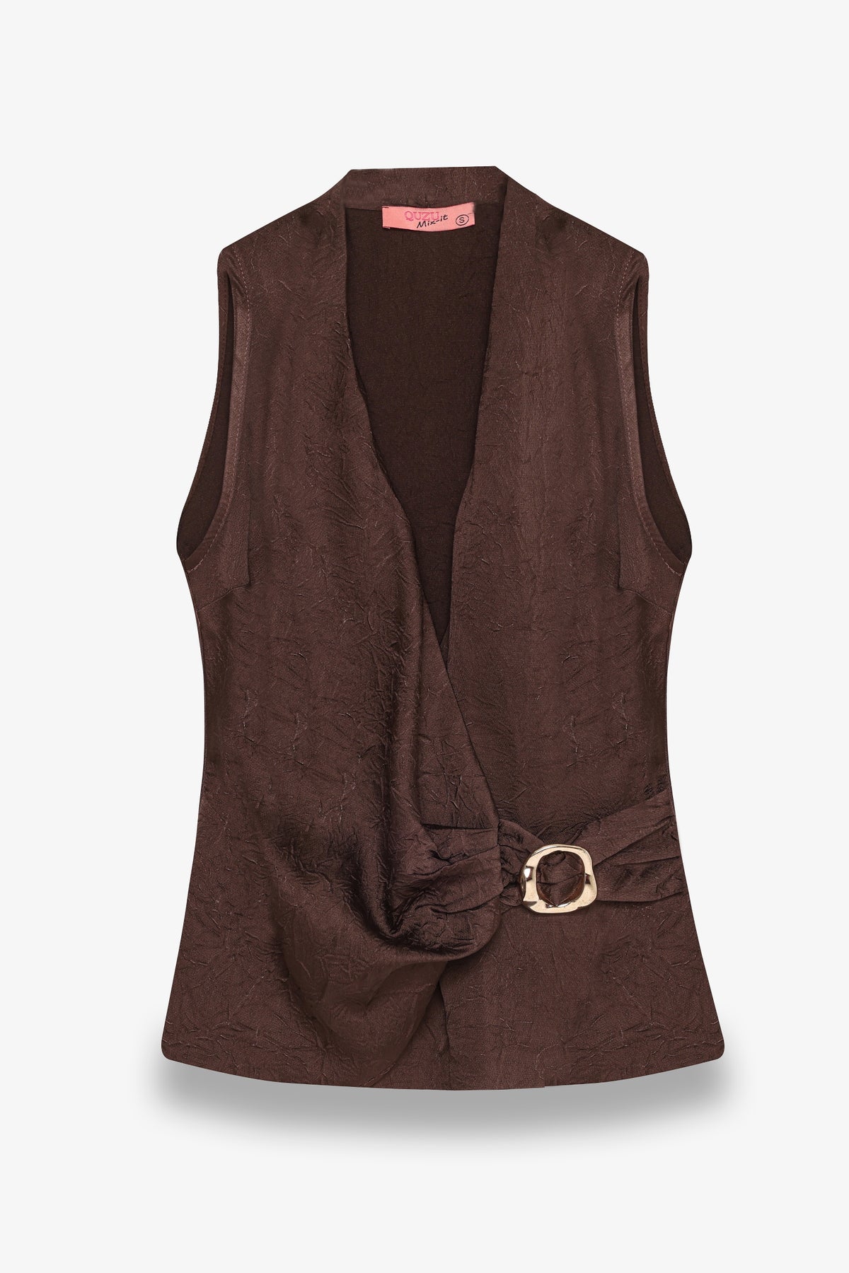 V yaka formda, fermuar kapamalı, toka askesuar detaylı, anvelop kesim, cepsiz, dokulu kumaştan üretilmiş, astarsız, kolsuz bluz.