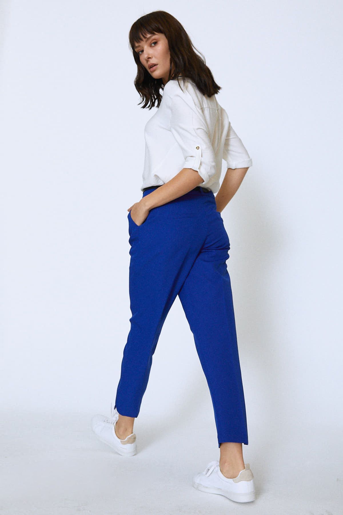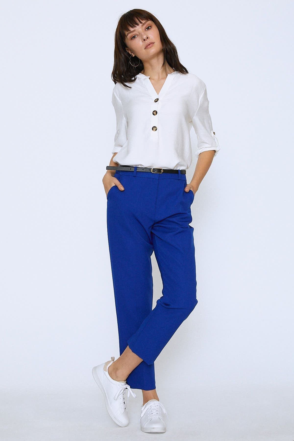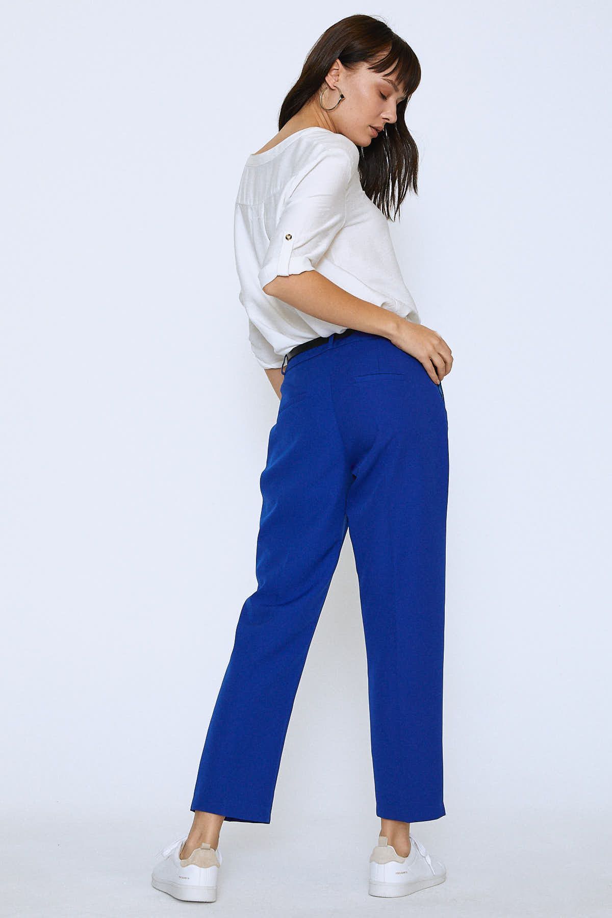 Formu ile ofis stiline, kısa paça boyu ile günlük stile uyacak beli kemerli pantolonu gömleklerle tamamlayabilir, kısa topuklu botlarla kombinleyebilirsin.