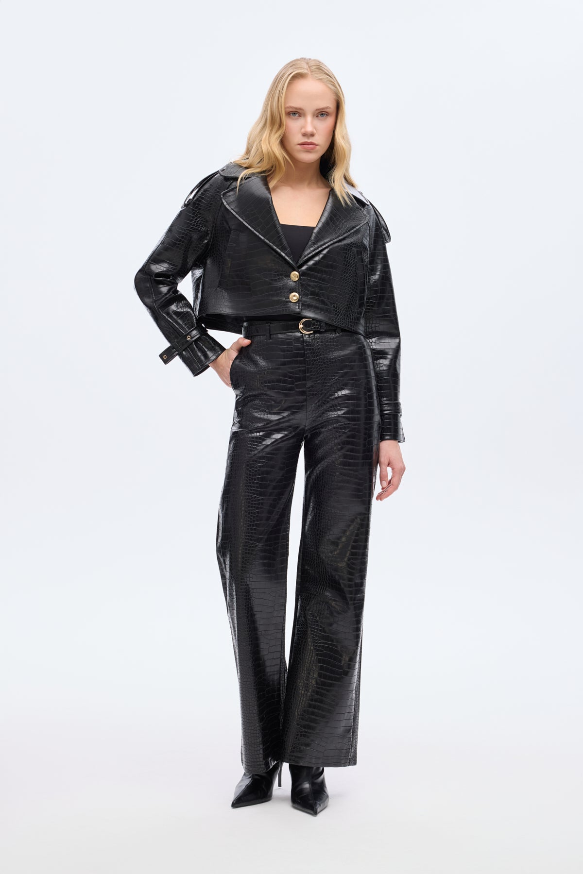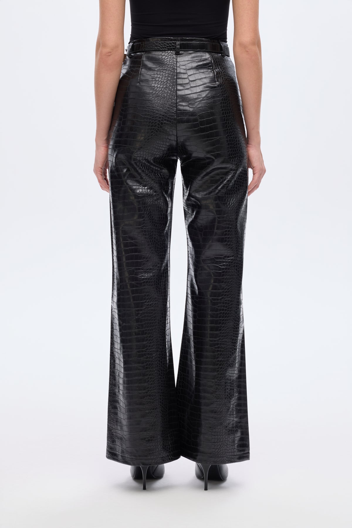 Kroko desen dokulu, yüksek bel, içi şardonlu, kemer tokalı, bol paça, fermuarlı kapamalı, yan cepli, suni deri pantolon.