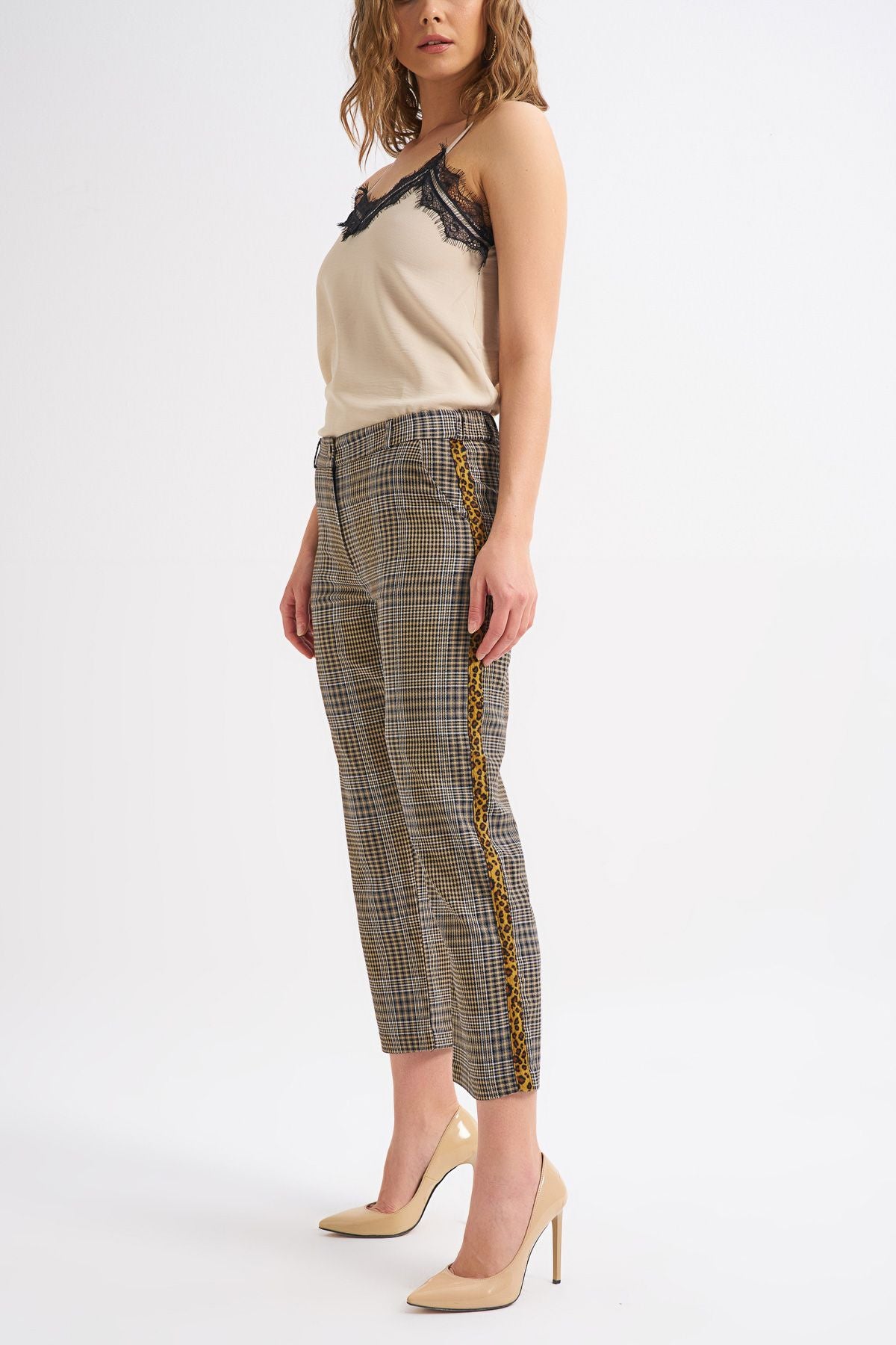 Ekose çizgileriyle modern bir forma sahip ve her dönemin modasında yerini almış leopar desenli şerit detayıyla dikkat çeken bu pantolon, favori kombinlerinde yerini almaya hazır.