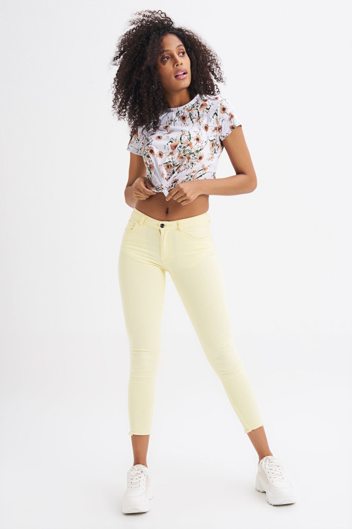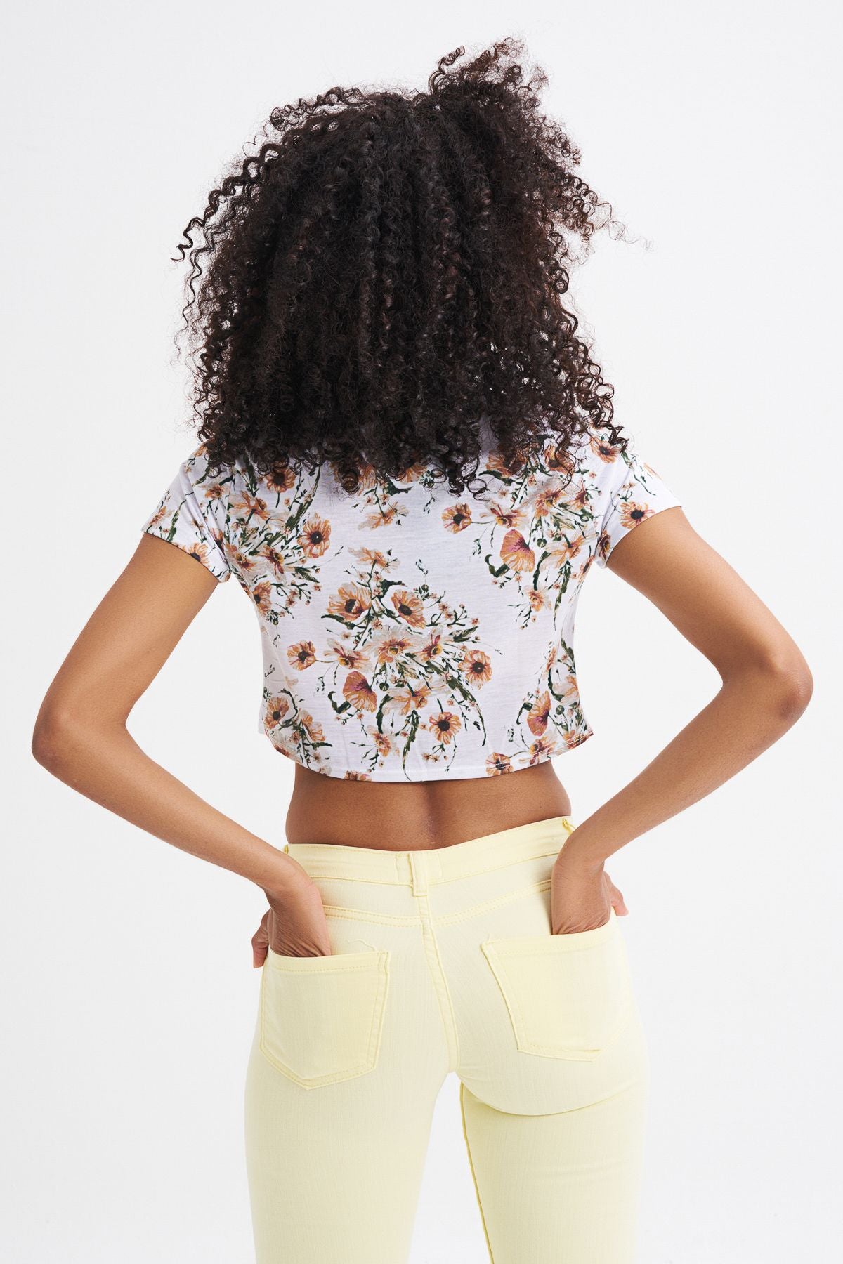 Çiçek Desenli Önü Bağlamalı Tişört Ekru