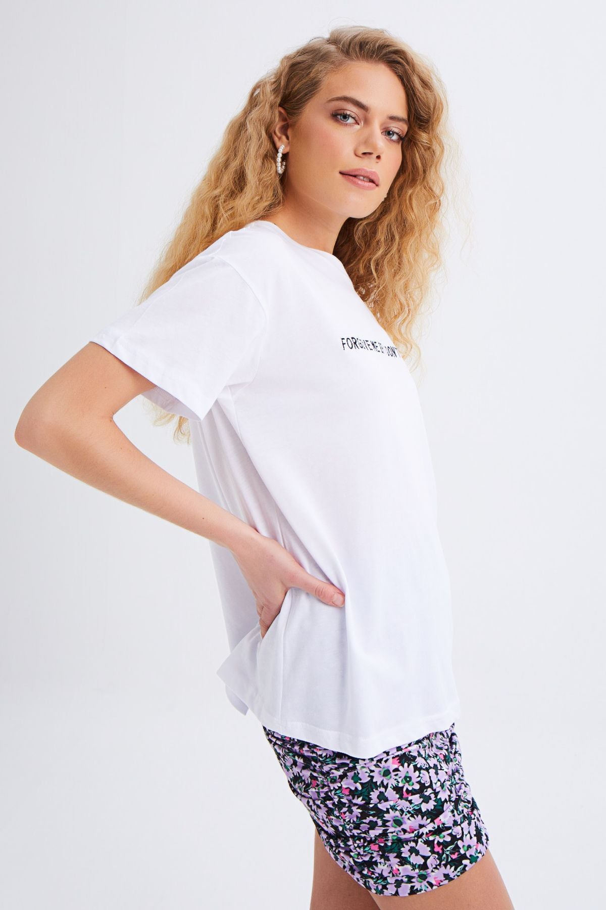 Nakış İşlemeli Sloganlı Tişört Beyaz