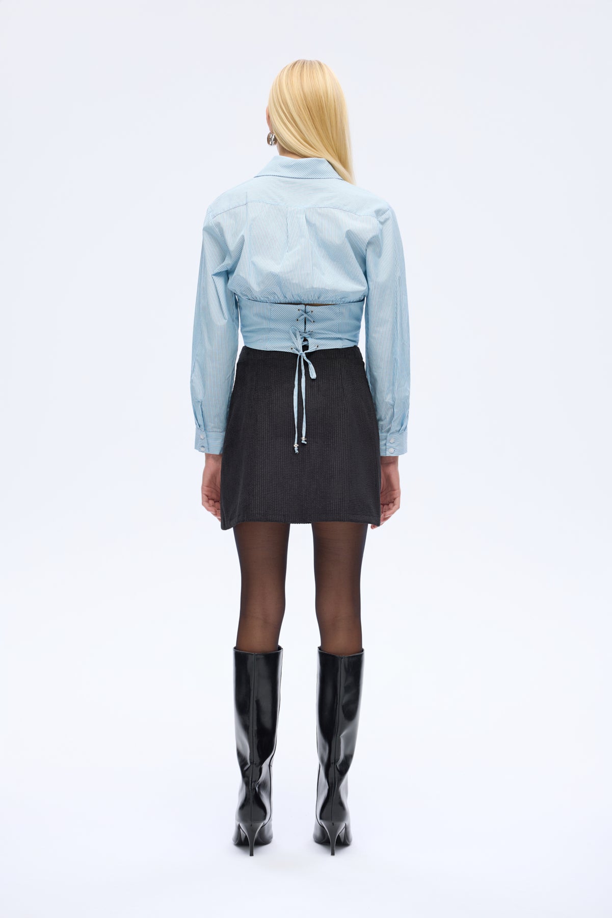 Kahverengi çizgili desenli, uzun kollu, nakış işleme detaylı, gömlek yaka, önü düğmeli, bel kısmı lastikli bağcık detaylı, korse formunda crop boy gömlek.