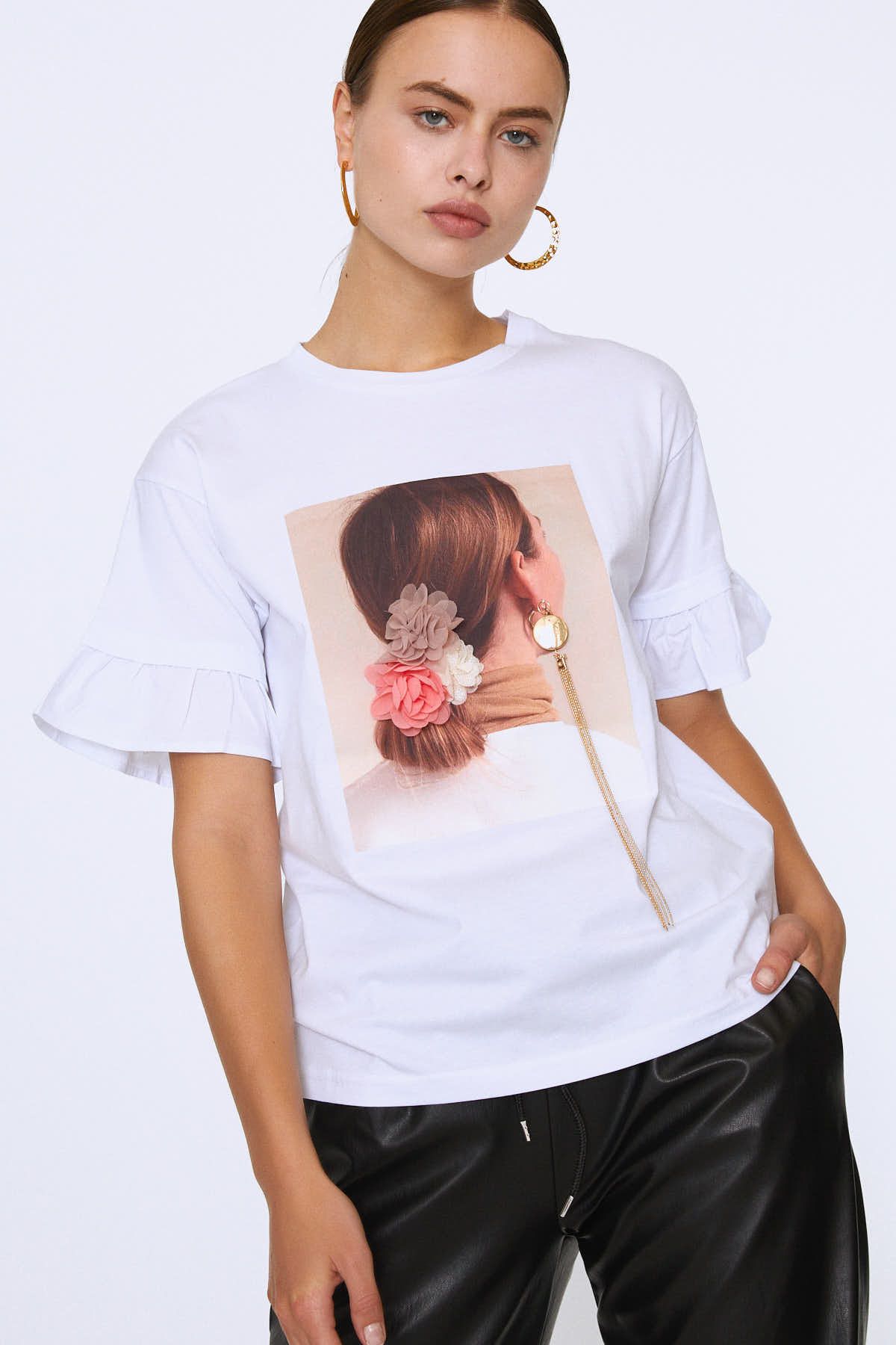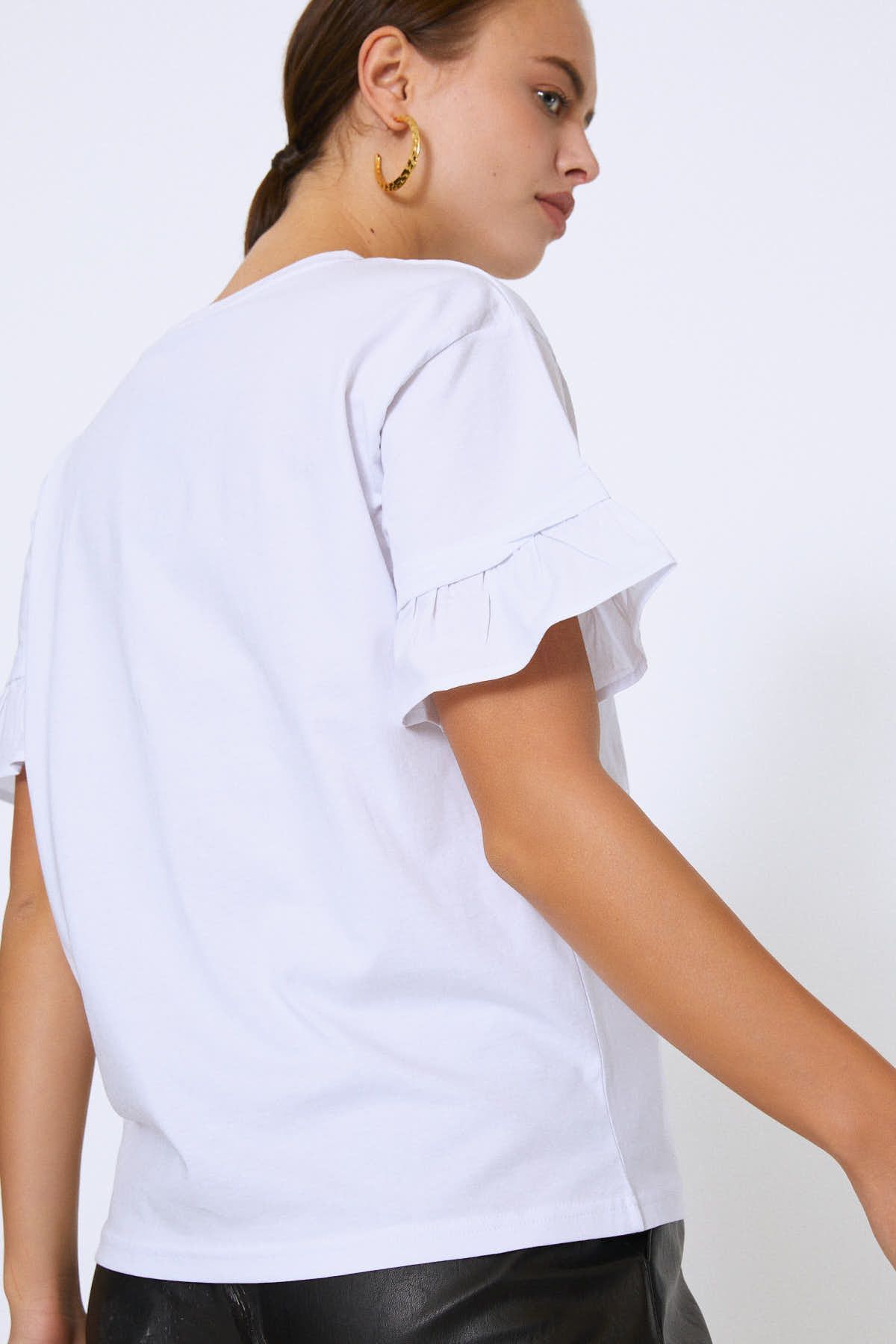 Önü Baskılı Kolları Fırfırlı Tişört Beyaz