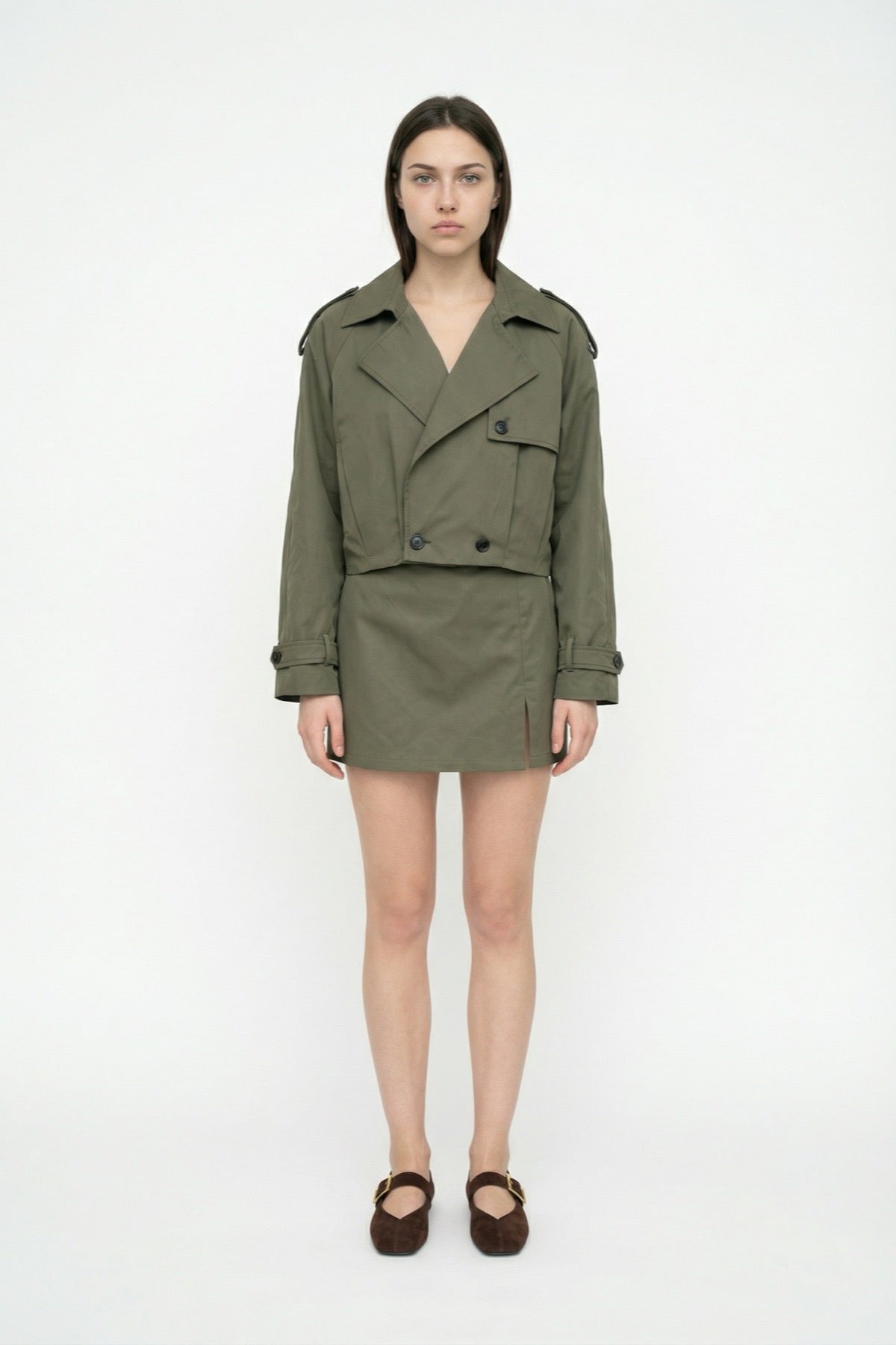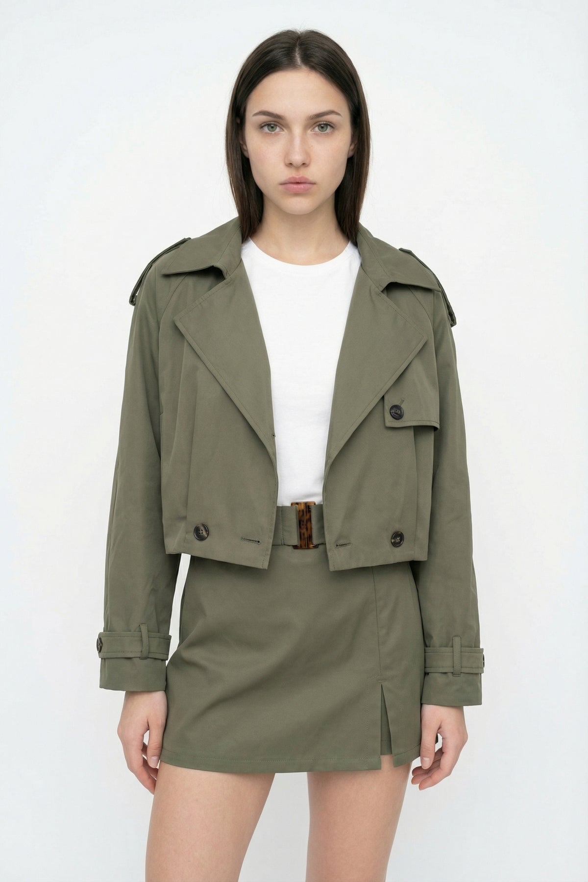 Apoletli Kruvaze Yaka Kısa Trençkot Haki