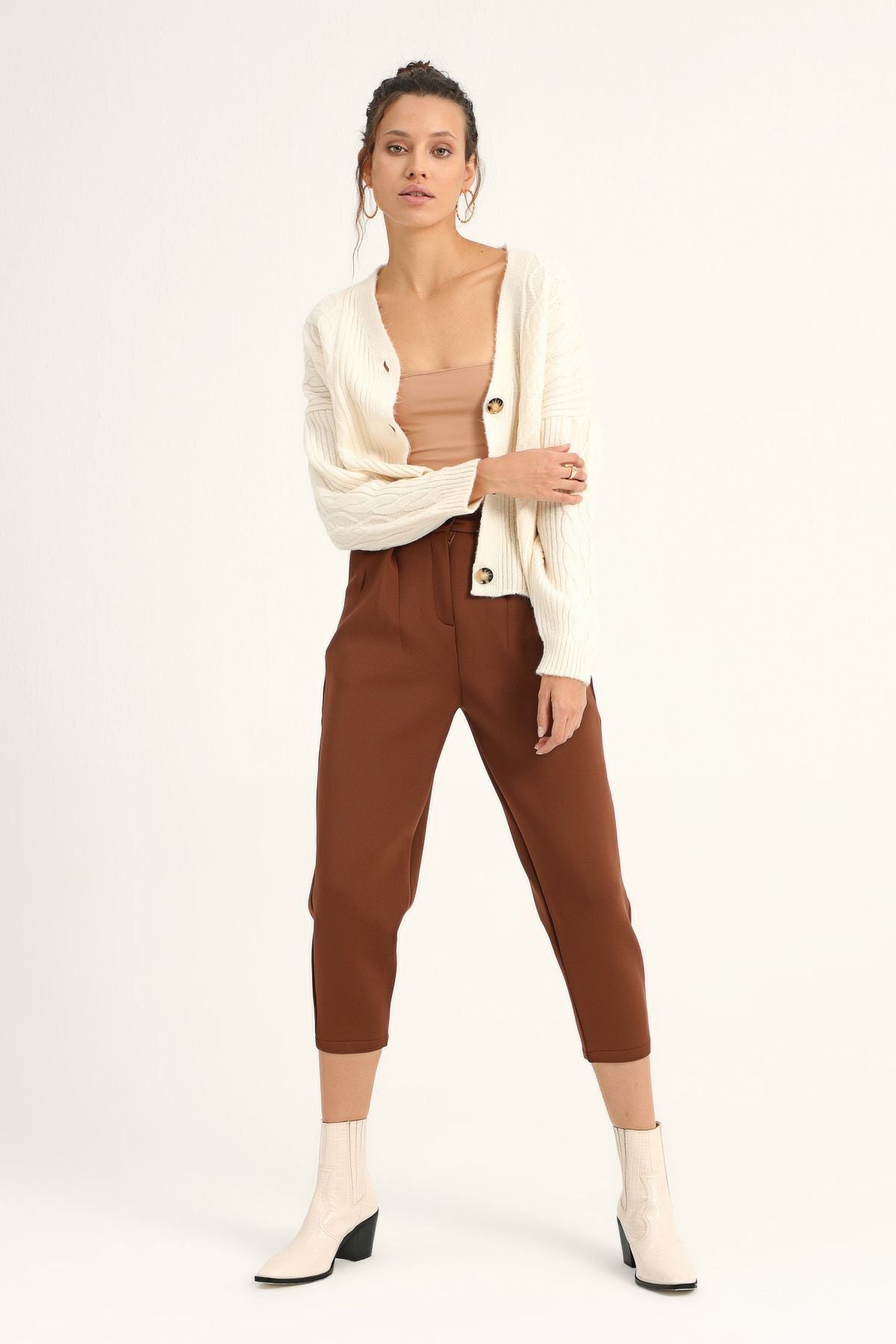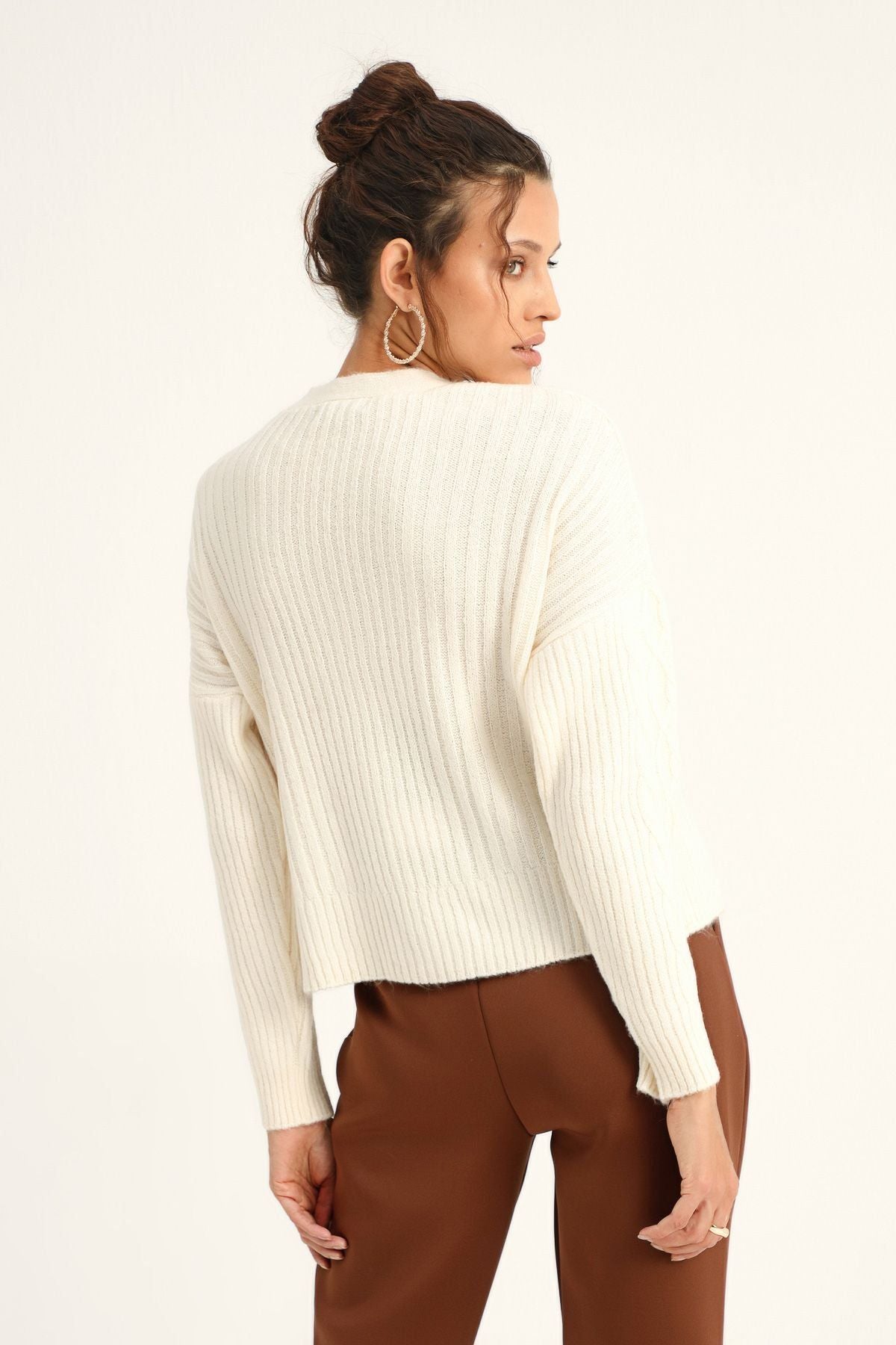 Baklava Desen Düğmeli Hırka Ekru