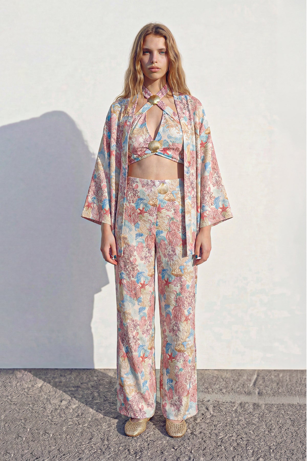 Çiçek desenli, uzun kollu, astarsız, rahat kalıp, cepsiz, ön kısmı kapamasız açık form tasarıma sahip kısa kimono.