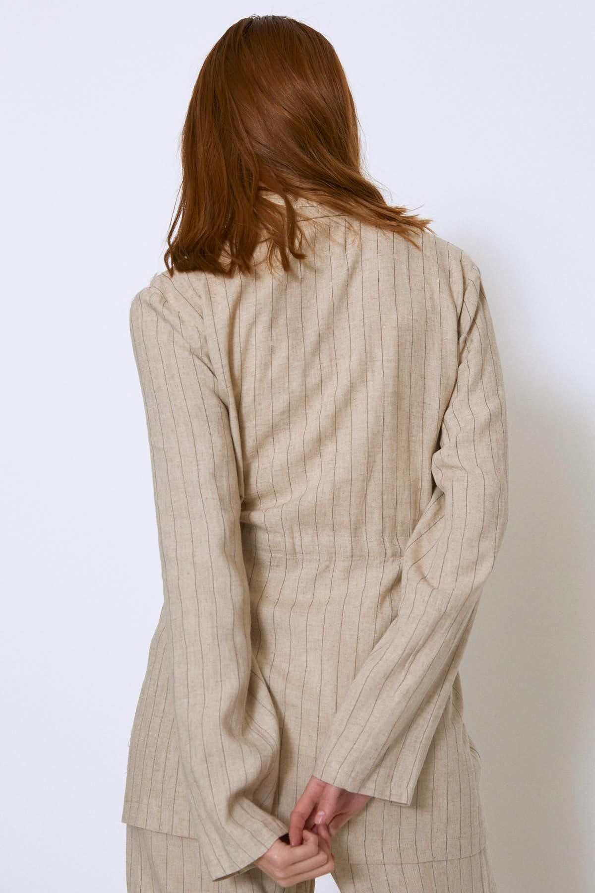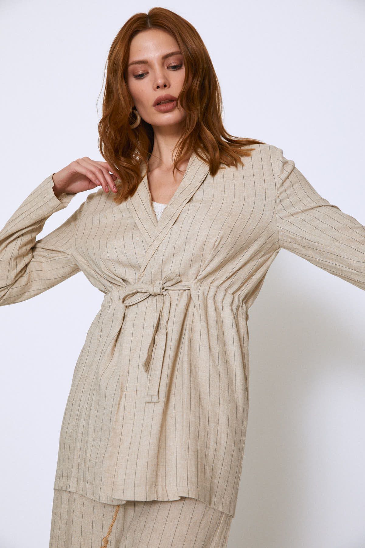 Çizgili Beli Kuşaklı Keten Ceket Bej