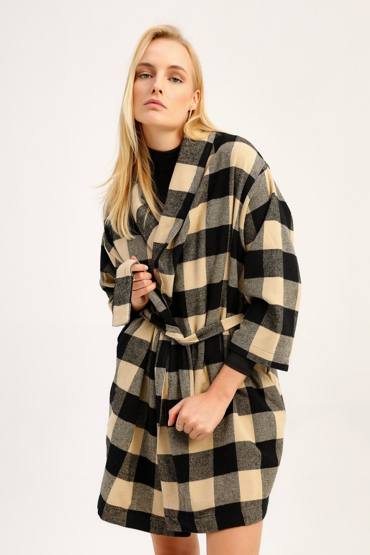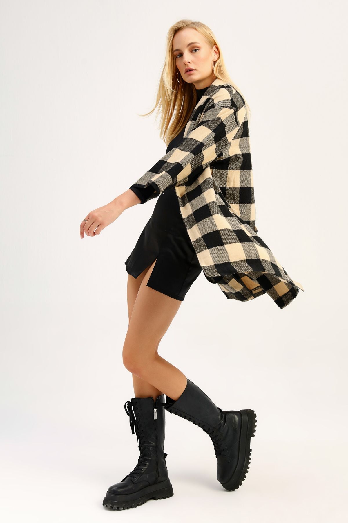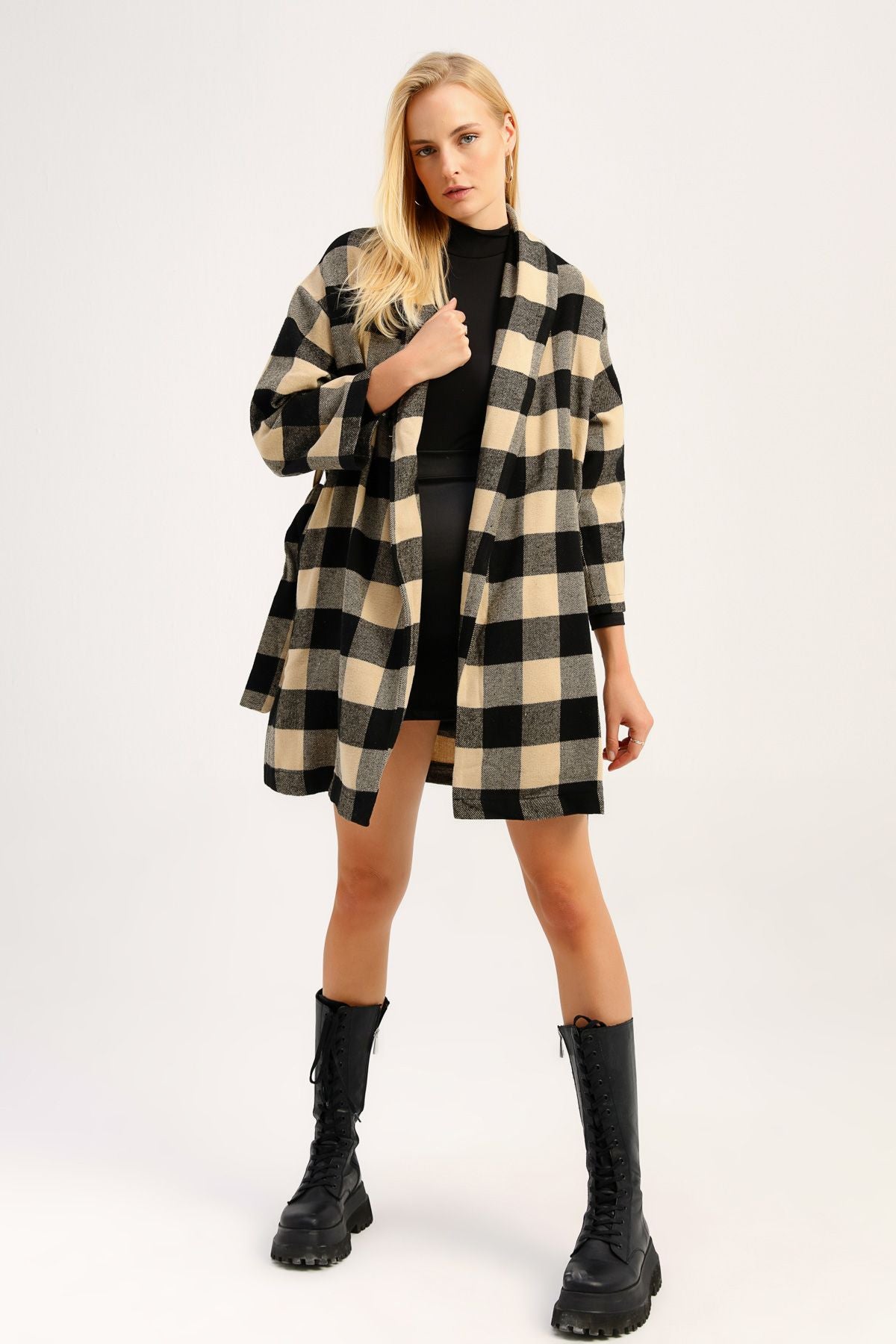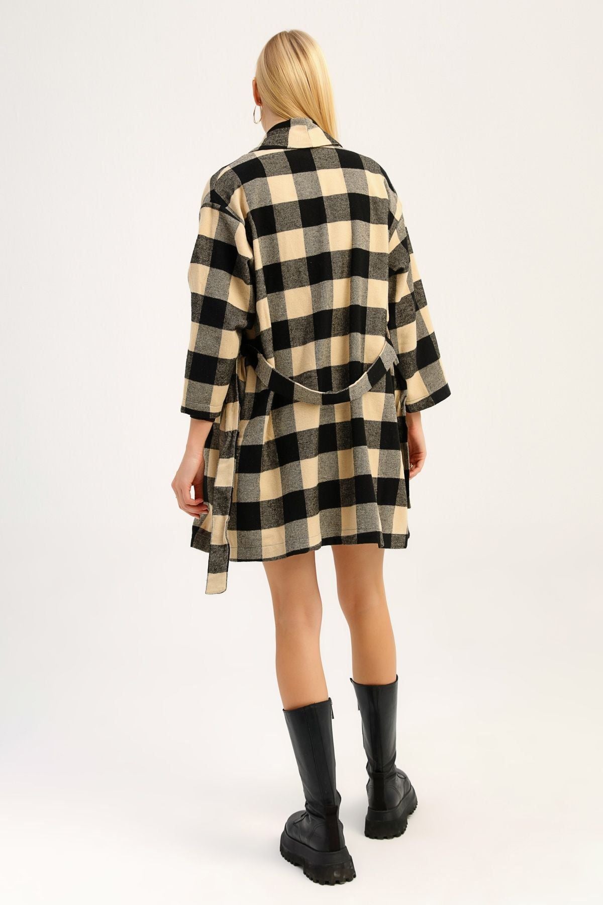 Ekose Uzun Ceket Siyah