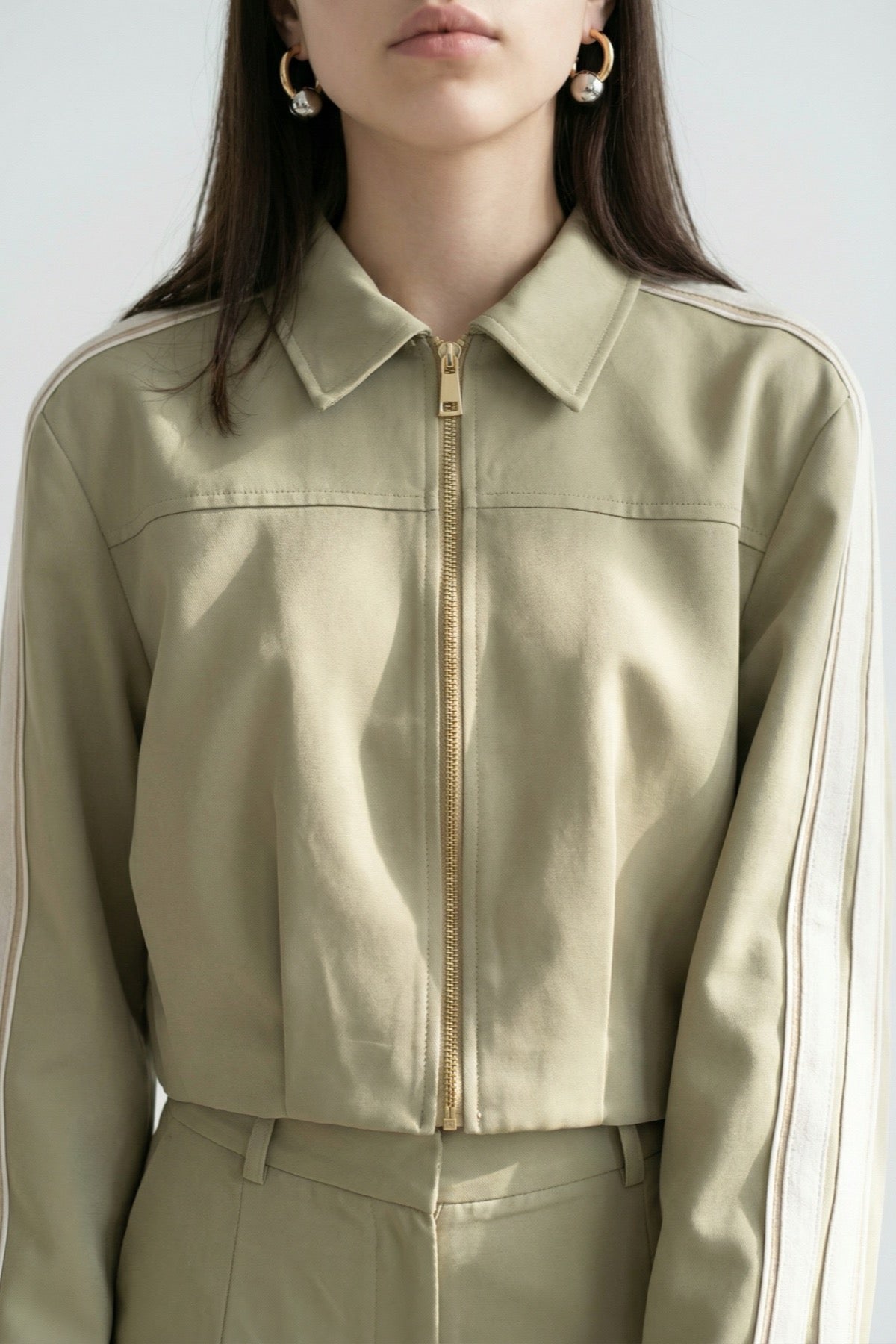 İçi astarlı, klasik yaka, önü fermuar kapamalı, uzun kollu, kol yanları kontrast şerit detaylı, önü pileli, crop ceket.