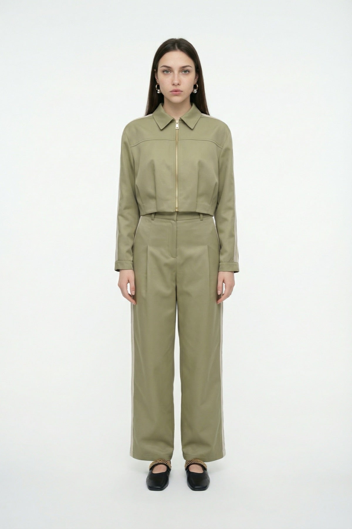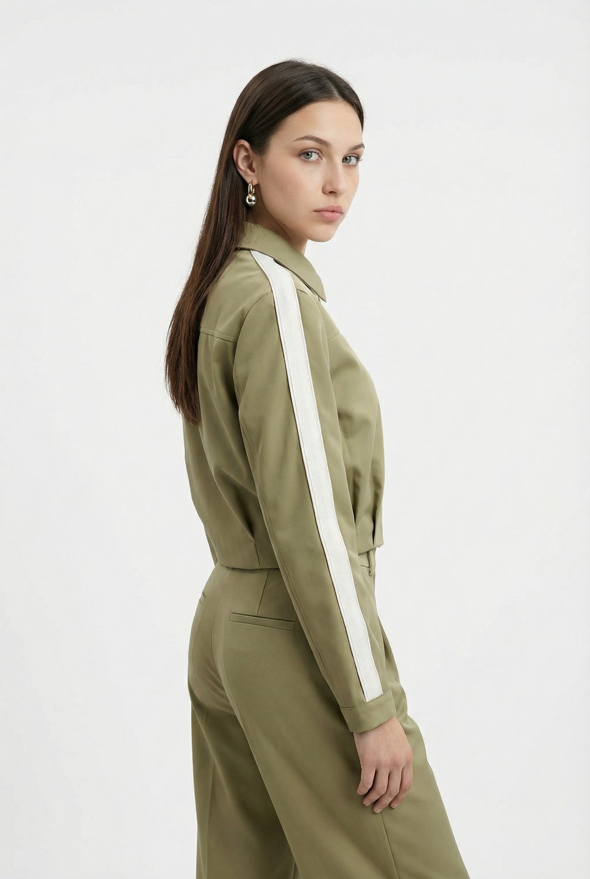 Ön Pileli Şeritli Crop Ceket Haki