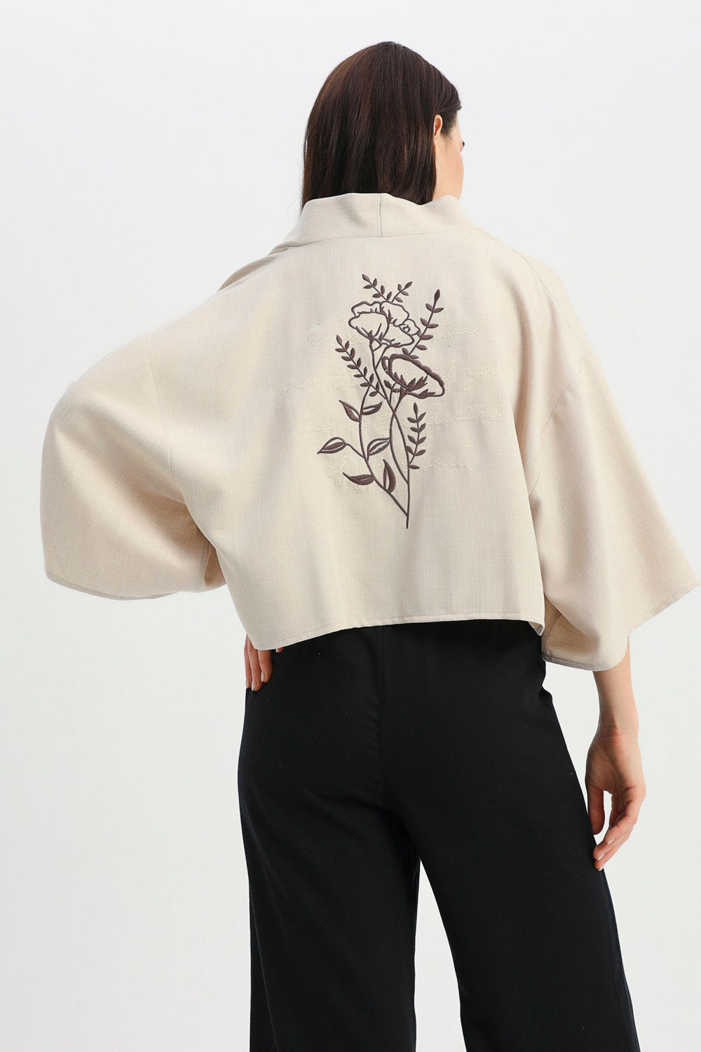 Arkası Nakışlı Bağlamalı Kimono Bej
