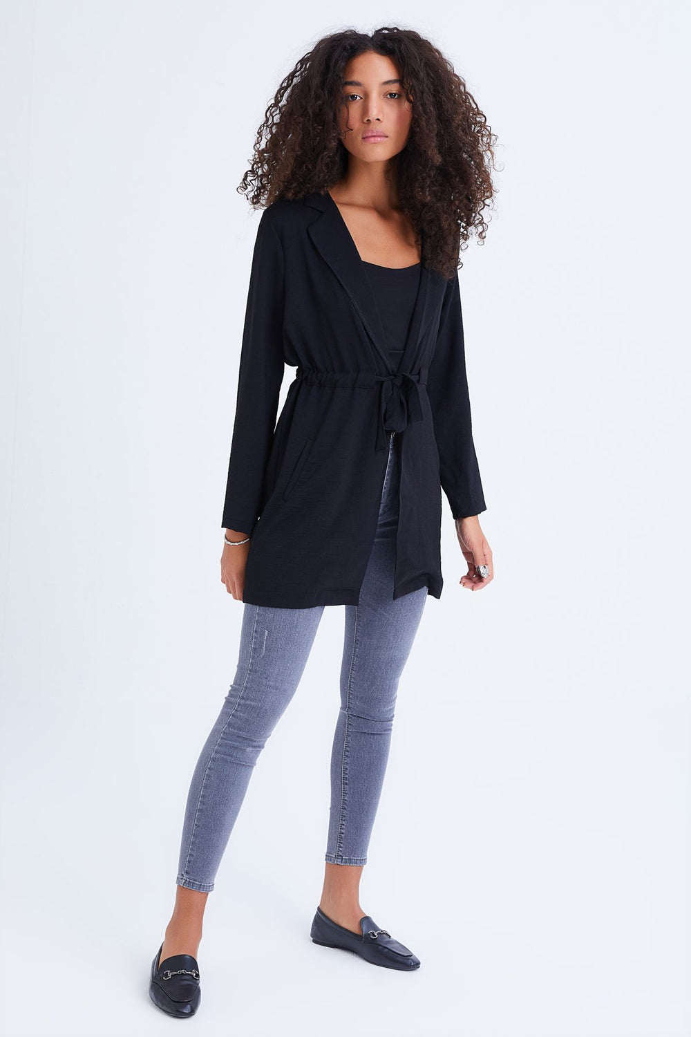 Beli Kemerli Kruvaze Kapama Ceket Siyah