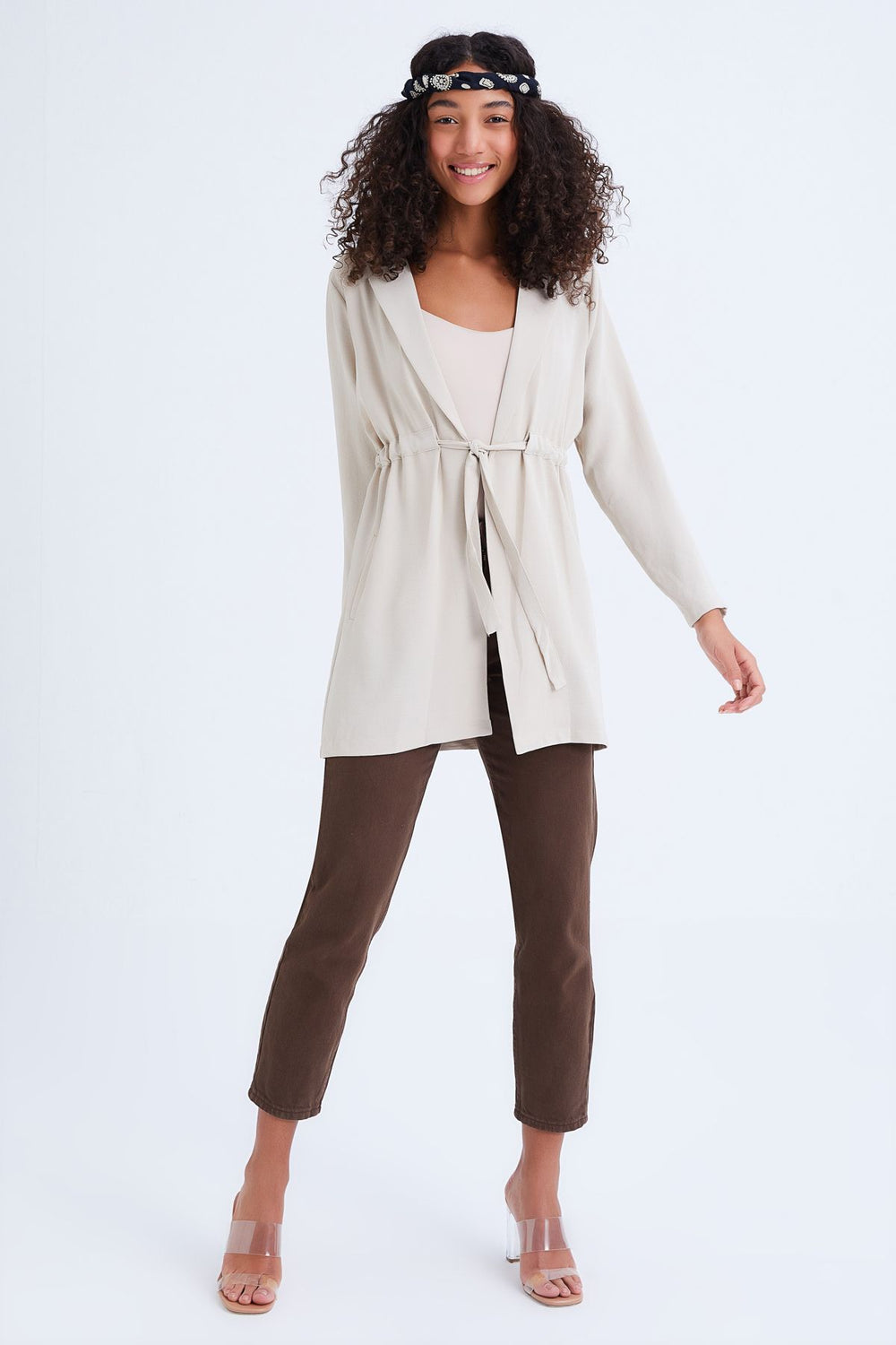 Arkası Nakışlı Kuşaklı Keten Ceket Naturel