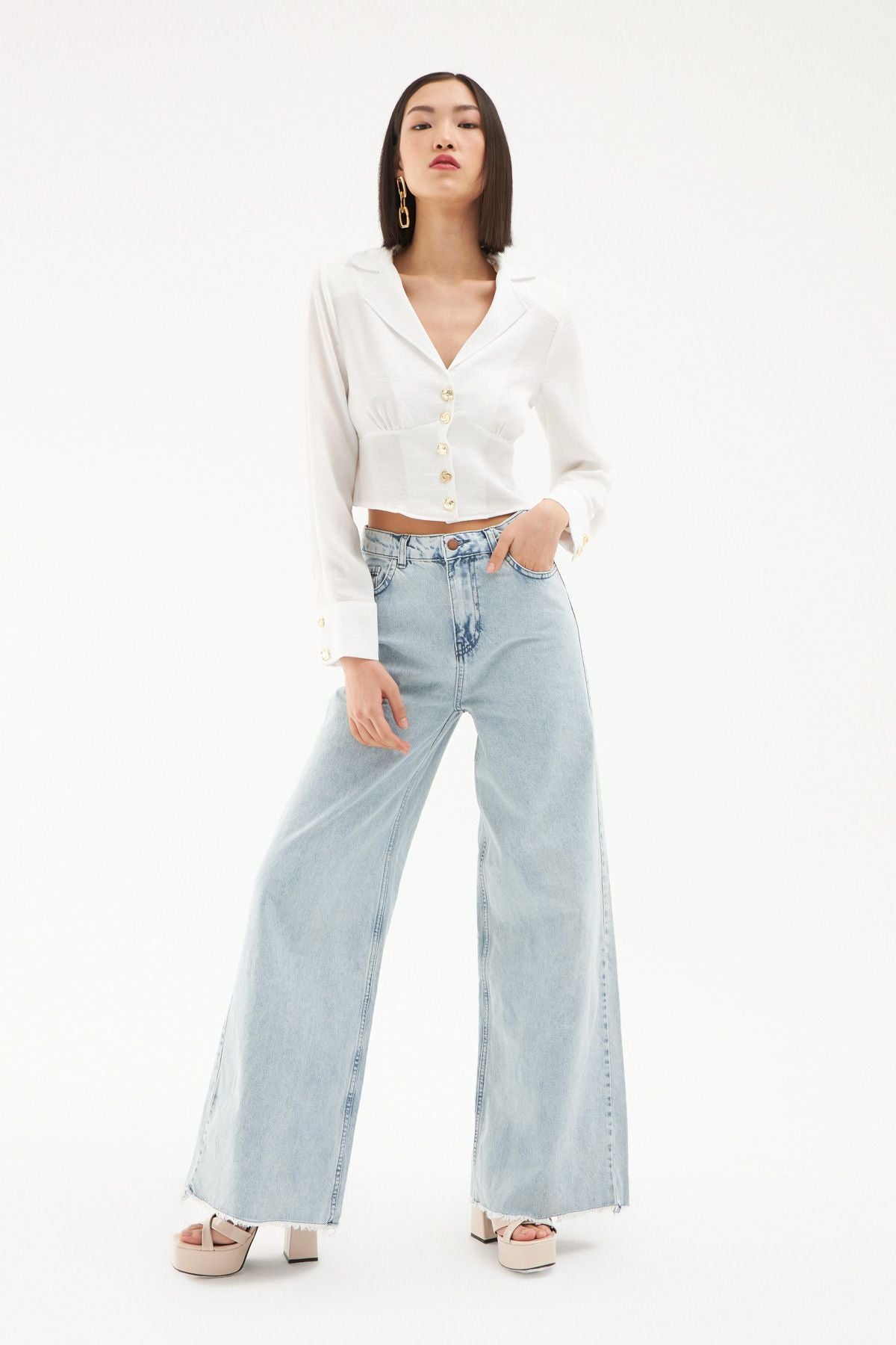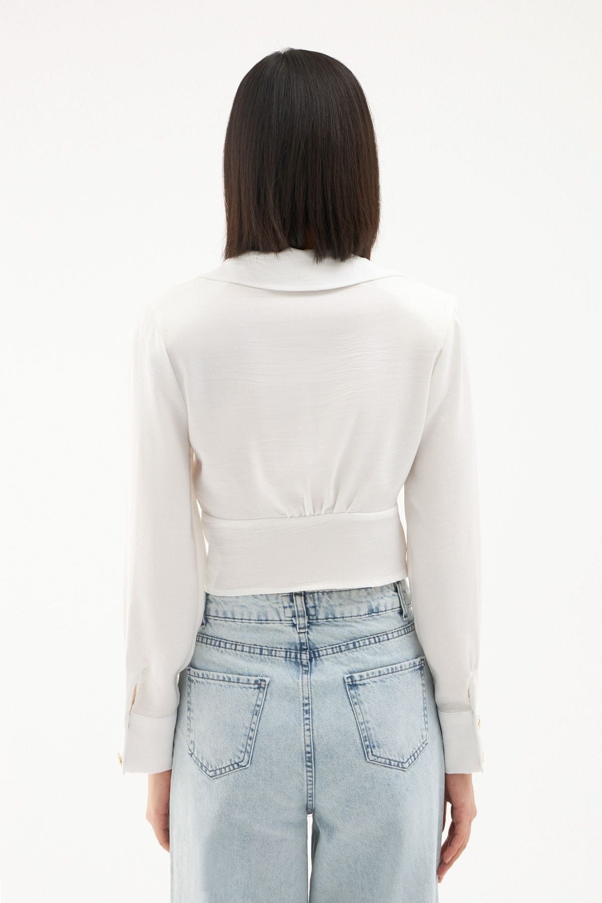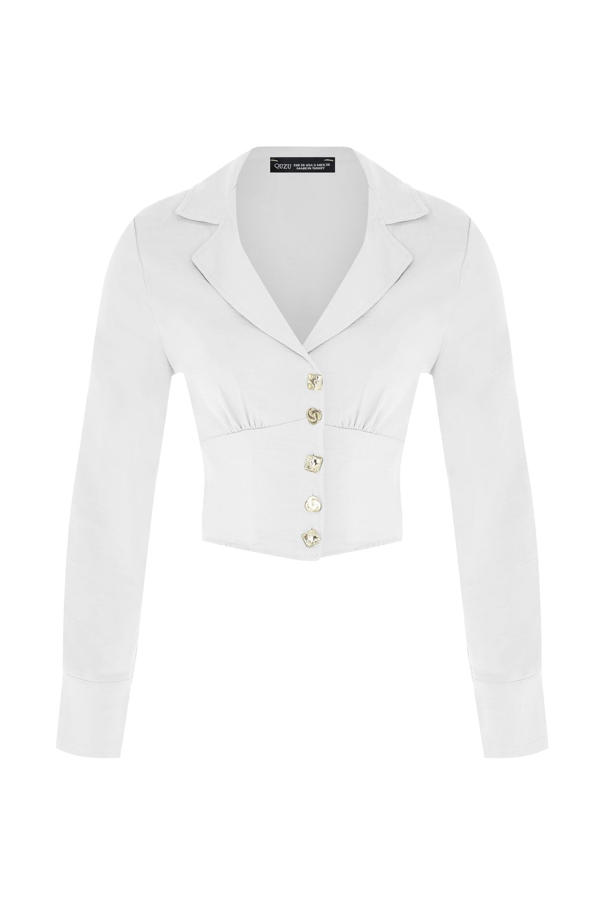 Gömlek yaka yapısı ve tasarımı ön plana çıkaran geometrik şekillerdeki gold düğme detayları ile stilinin farkını ön plana çıkaracak vatkalı crop gömlek modeli favori parçalar arasında yerini alıyor. Özel tasarım detayları ile kombinlerine hoş bir enerji katacak uzun kollu bluz modelinin vatkaları omuzlarına daha güçlü bir görünüm sunuyor. Vatkalı bluz modelinin bele oturan tasarımı ve hafif parlak dokusu şık kombinlerin için ideal bir seçenek oluyor. Derin v yaka bluz modeli vatkalı ve geometrik düğme detayları ile hoş ve zarif bir görünüm kazanıyor.