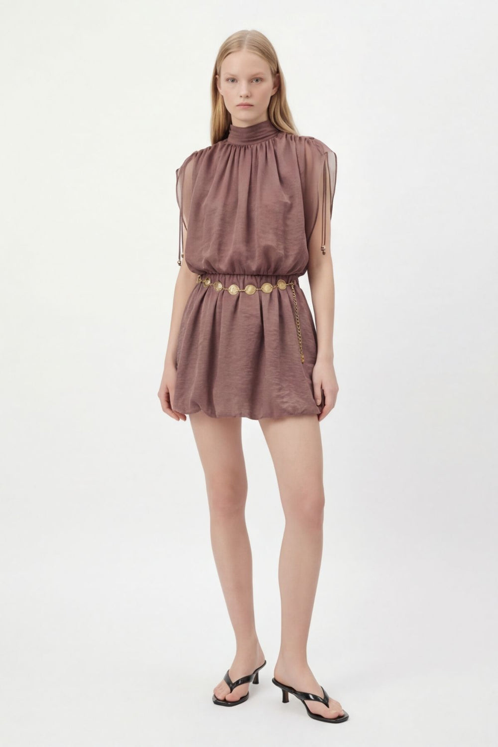 Yarasa Kol Zincir Kemerli Mini Elbise Kahverengi