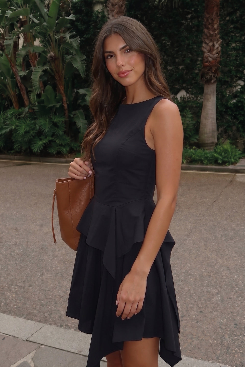 Asimetrik Volanlı Kolsuz Mini Elbise Siyah